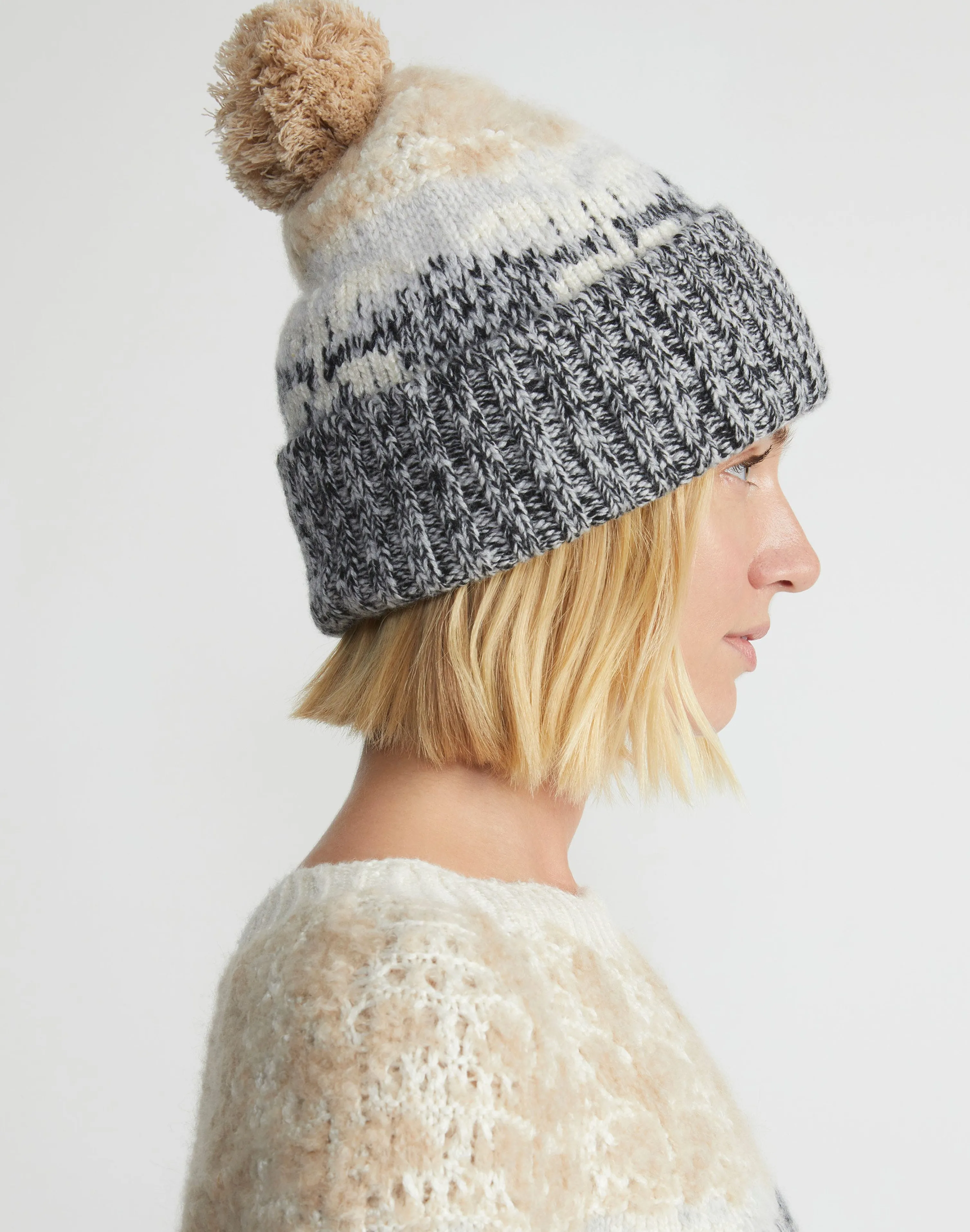 Channeling the collection’s cozy Upstate aesthetic, this soft, graphic beanie luxuriously reimagines traditional Fair Isle through intricate jacquard, meticulously knit from ultra-fine cashmere, lustrous silk and smooth camel hair. It’s finished with a ribbed cuff and adorned at the top with a hand-fringed pom.