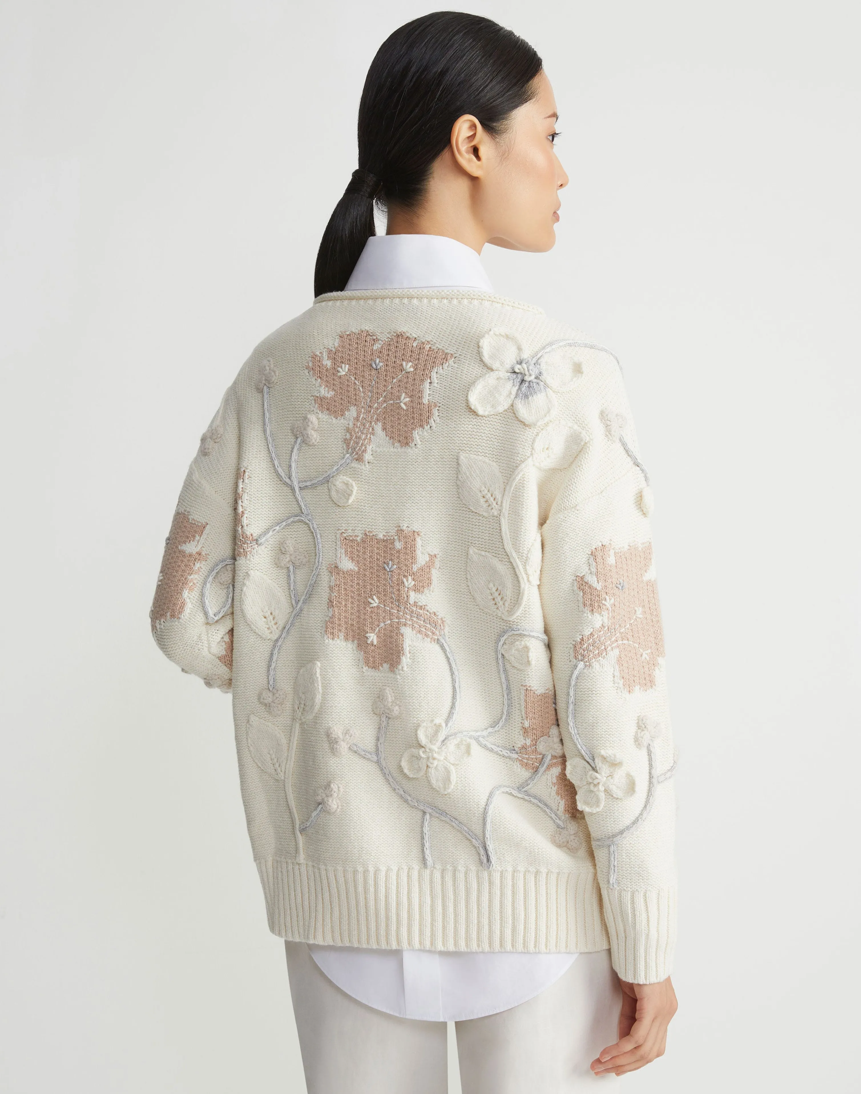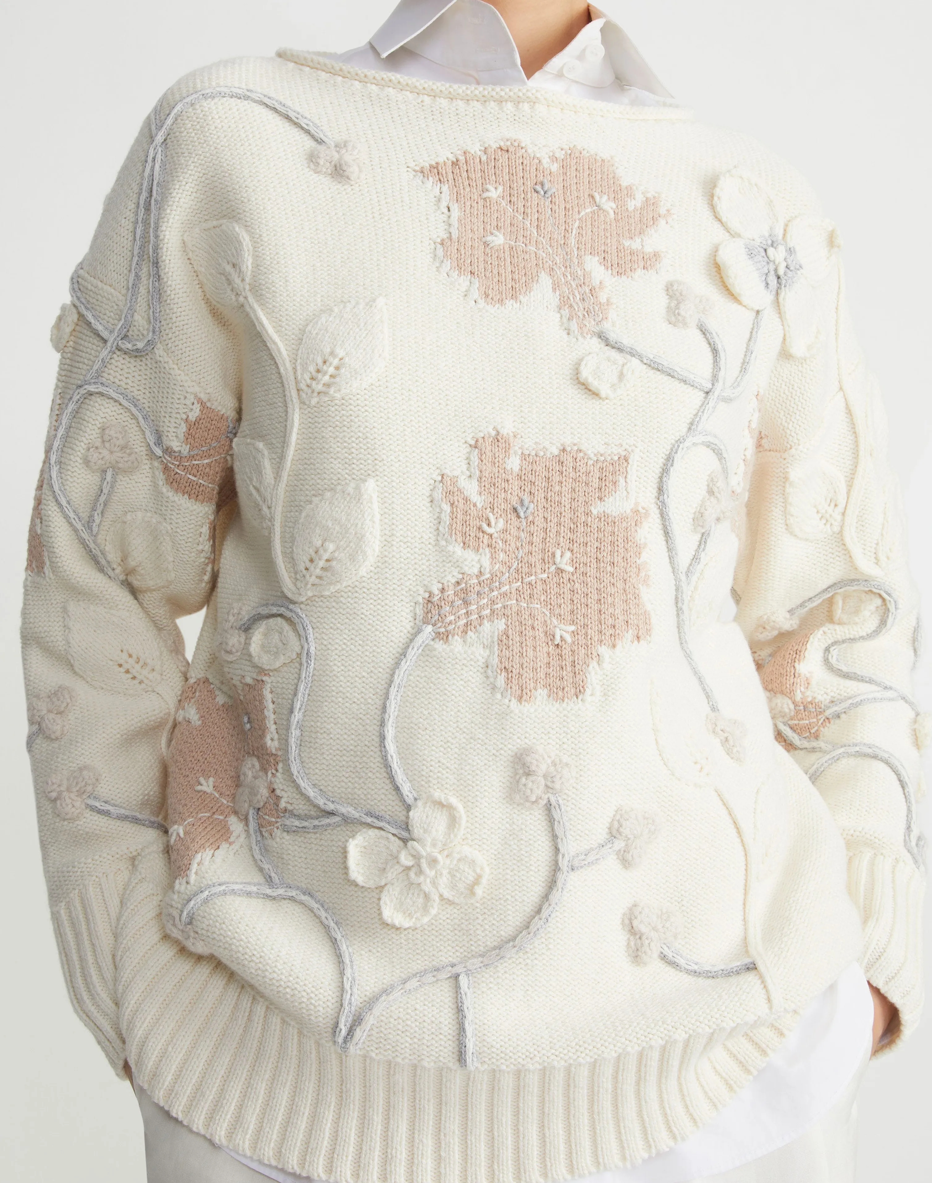 Masterful technique and technical artistry combine in this bateau neck sweater. It’s meticulously knit in a reverse jersey jacquard and detailed with dimensional hand-embroidered flourishes channeling the Resort 2024 collection’s custom botanical artwork. Light yet lofty, crafted in cashmere-infused Italian cotton-wool yarns, the relaxed shape extends through softly dropped shoulders and features wide ribbed trims for cozy definition.