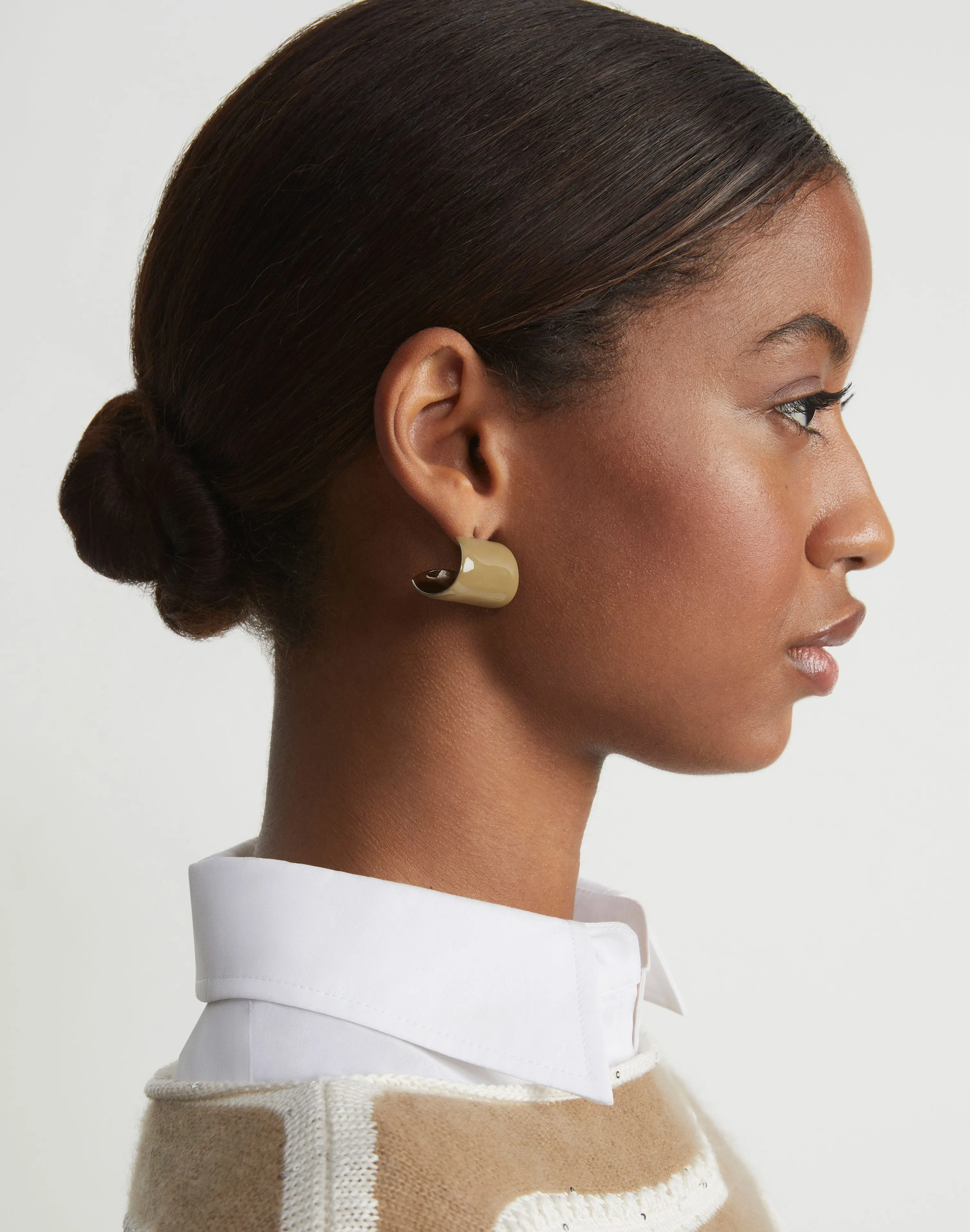 The House’s signature Italian-crafted Lune hoops are refreshed for Spring 2024, sculpted from refined brass and hand-painted with smooth enamel for subtle gloss. The gently curved, asymmetric shape features easy, post-back closures finished with L beam engravings.