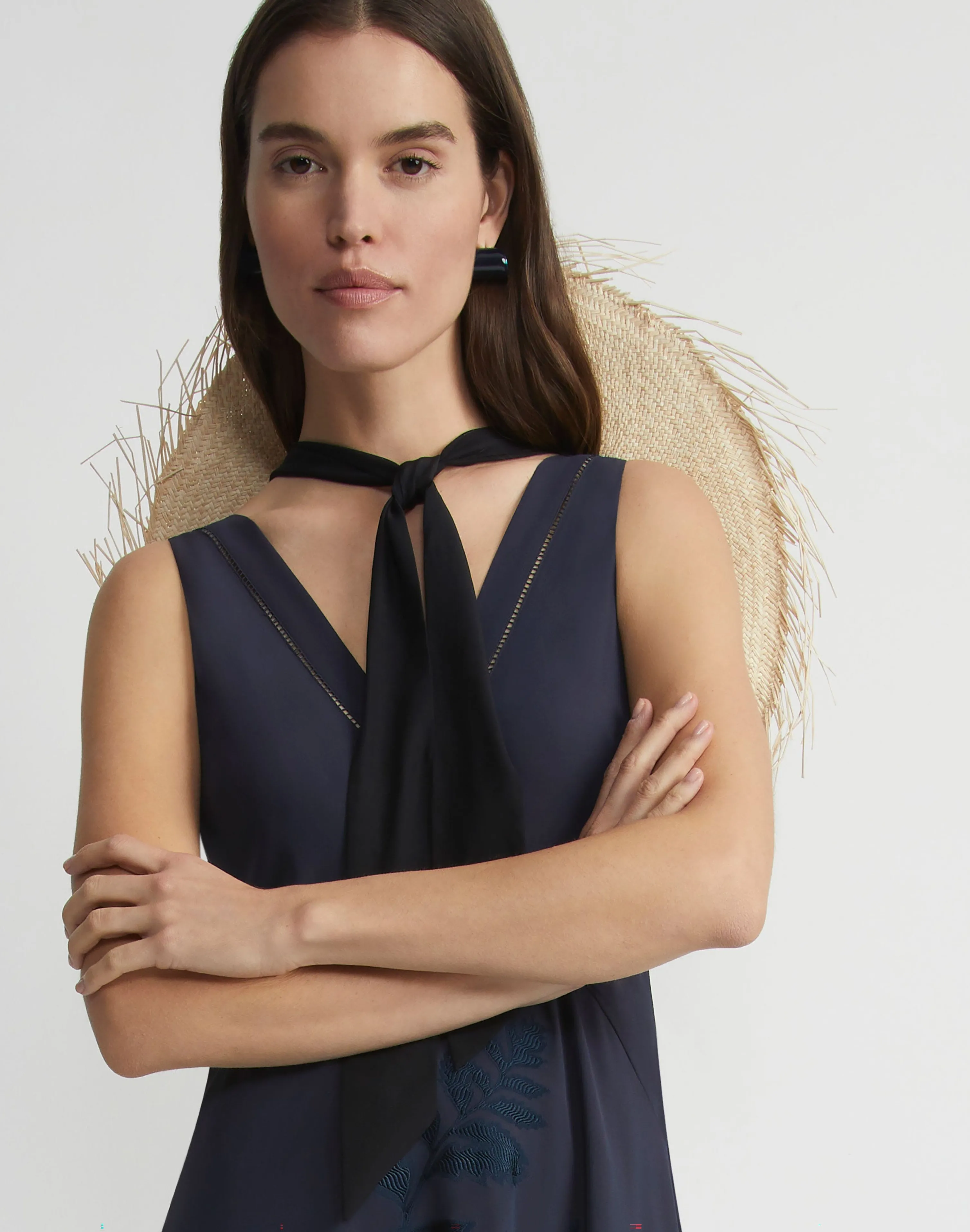 Reimagining traditional urban gardening uniform codes for Spring 2024, this sculptural sun hat is a versatile companion from city to sea, handwoven in Italy of Ecuadorian straw. Textural, basket-inspired fringe punctuates the wide brim, while the versatile silk twilly lends unexpected femininity.