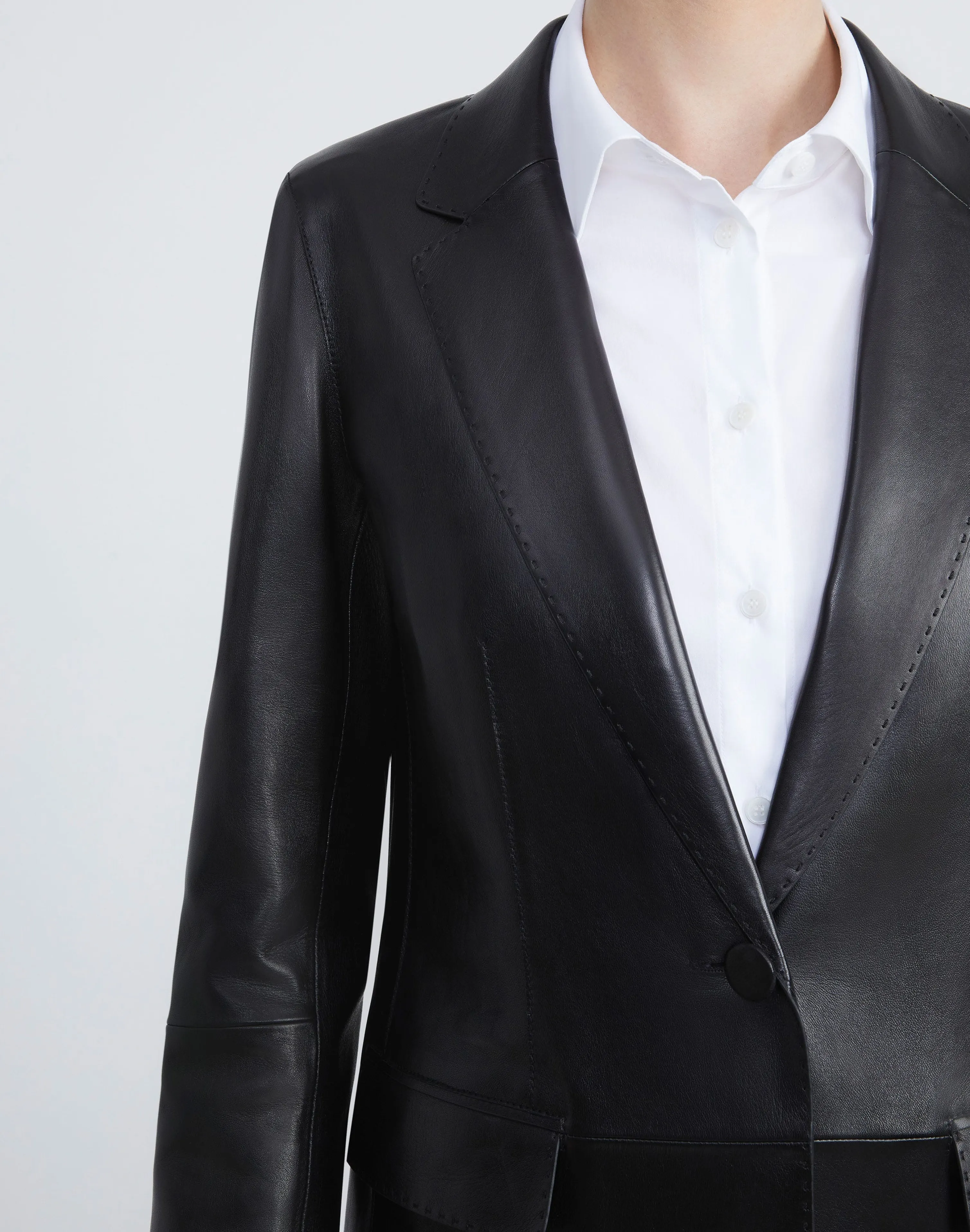 House-signature flawless construction and sartorial tailoring combine in this pared-back blazer, reimagined in luxurious Italian nappa leather. The straight silhouette is traced with artisanal topstitching and defined by soft shoulders, structural darting and single-button closure.