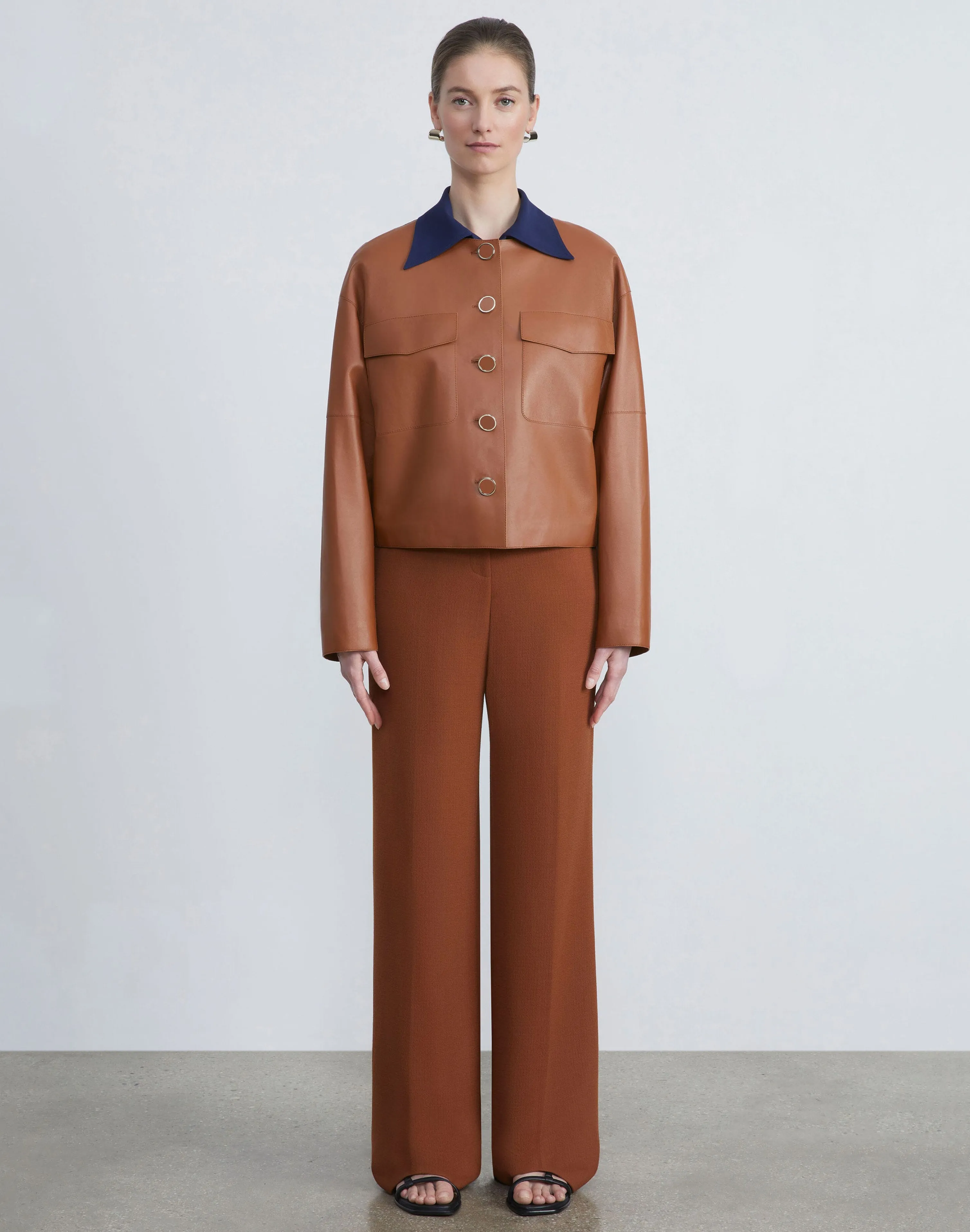 Smooth Italian nappa lambskin brings buttery texture and soft structure to this meticulously crafted jacket—elevated to modern proportions by an oversized fit and cropped length. The collarless design is lined with a quilted insulated interior, that’s both lightweight and exceptionally warm, and fastens with leather-trimmed metal buttons.