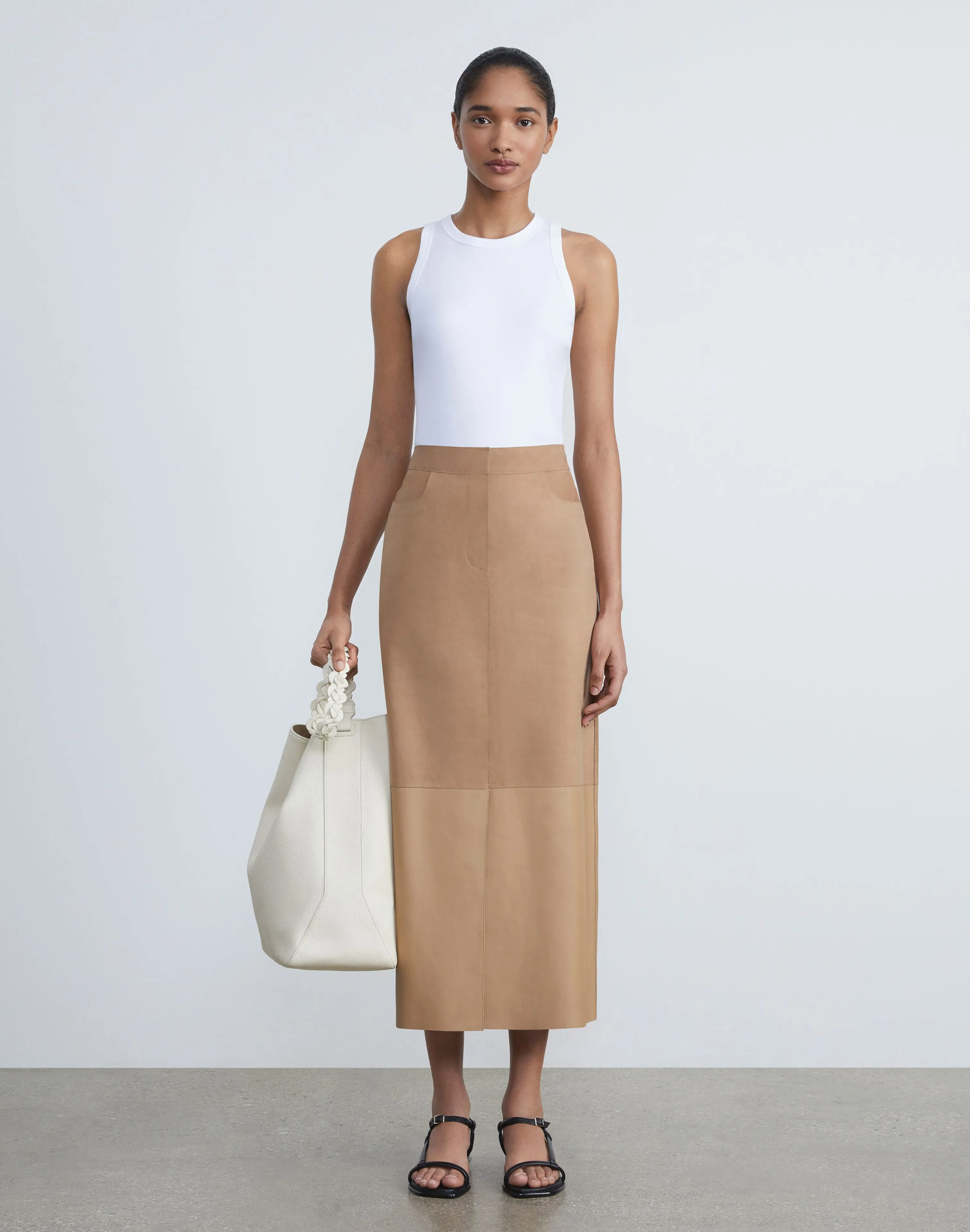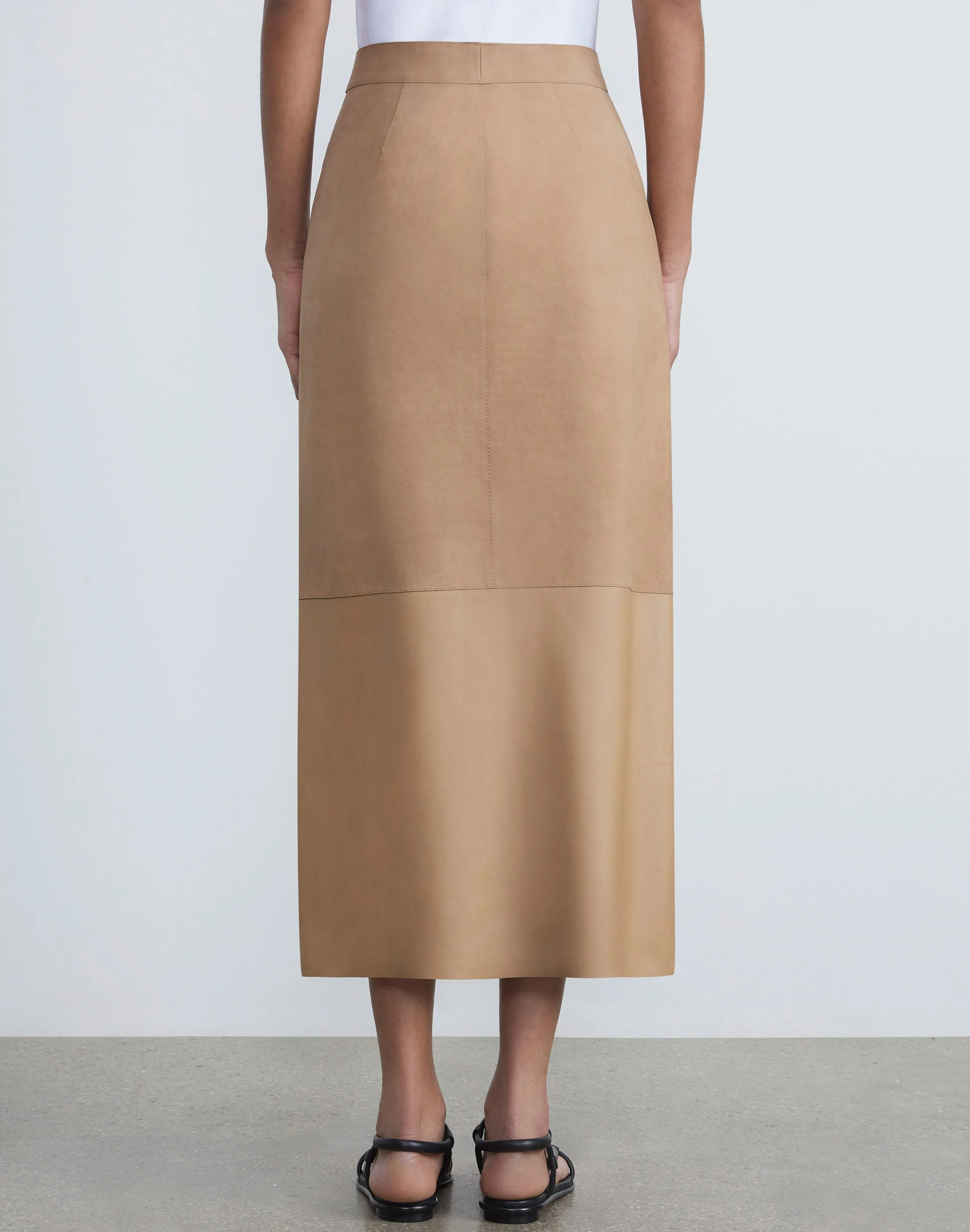 Understated luxury at its finest, this midi skirt combines ultra-soft, supple nubuck suede with buttery, paper-light nappa leather. It sits high on the waist with contouring darts and falls to a straight silhouette, offset by a center slit hem.