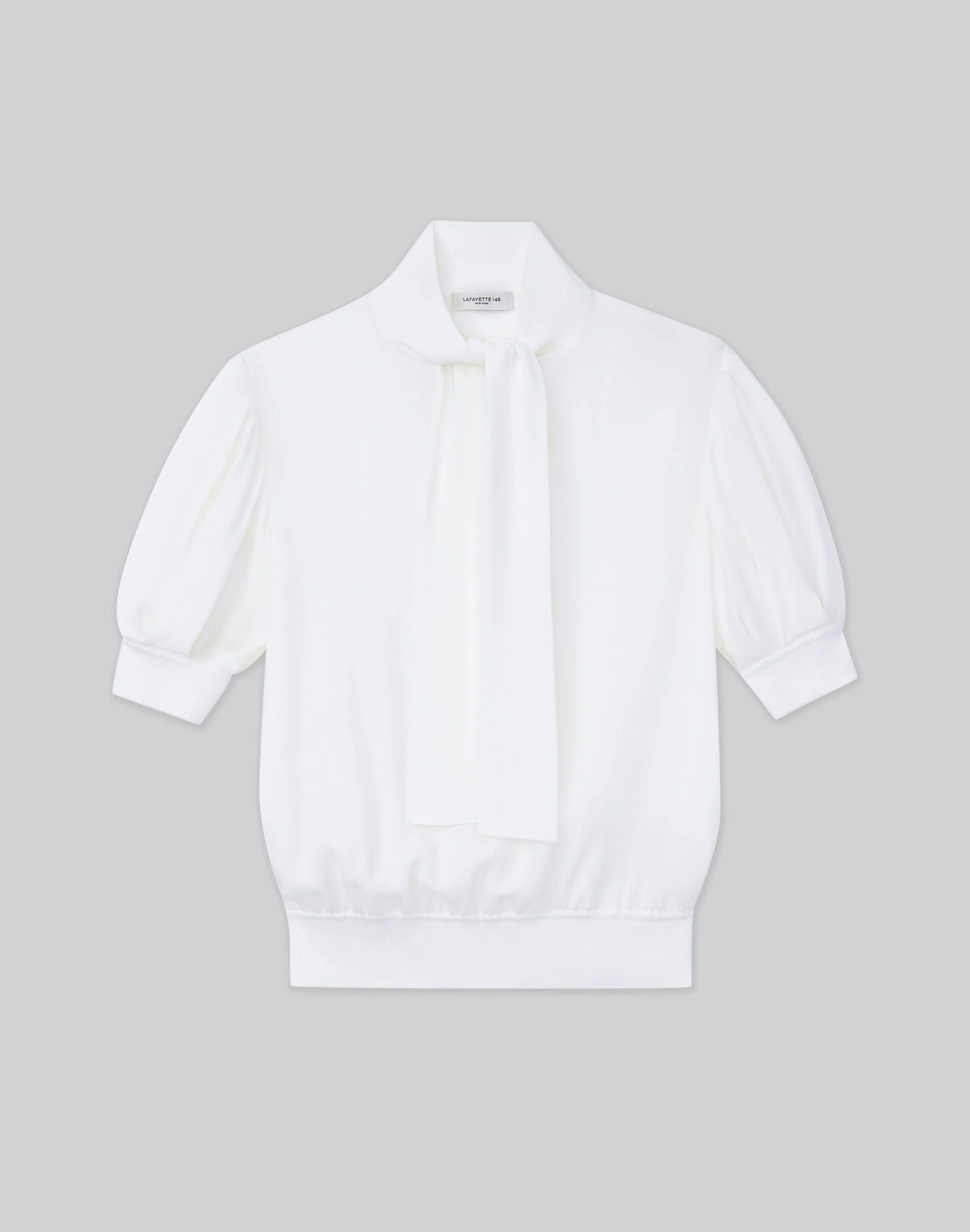 Soft structure meets immaculate drape in this short sleeve blouson blouse, masterfully crafted in organic silk georgette. Knitted Matte Crepe contrast at the sleeve cuffs and hem create measured volume, and the keyhole neckline is finished with a scarf bow—a pinnacle design detail of the Fall 2023 collection.