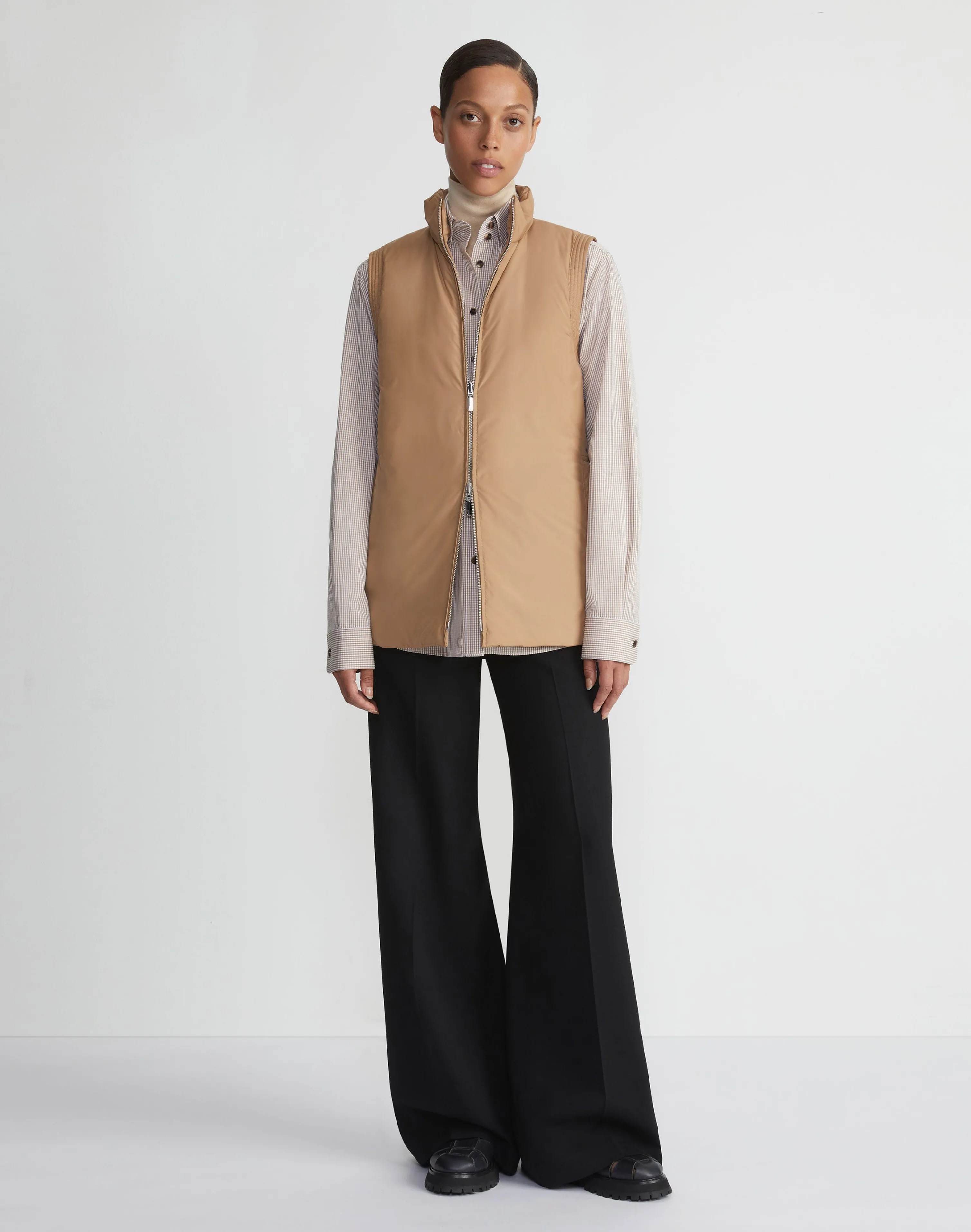 A transitional layering piece reimagined for modern warmth and versatility, this reversible puffer vest is consciously crafted from recycled fibers and insulated with plush fill. Exceptionally lofty yet light, and with a quilted construction that reverses to a smooth finish, the straight silhouette tapers at the waist with an elasticized drawcord and features L148’s signature dual-zip closure.
