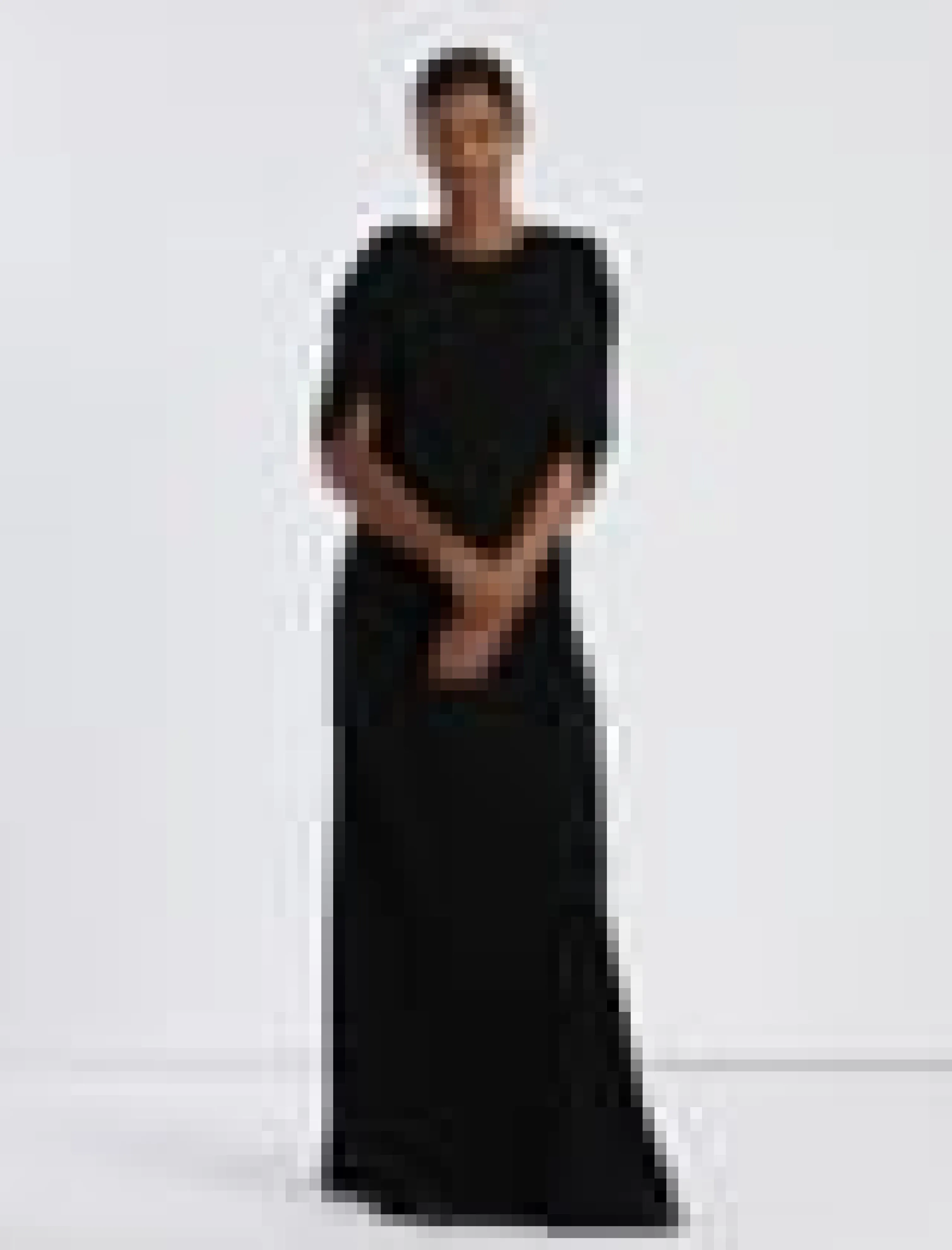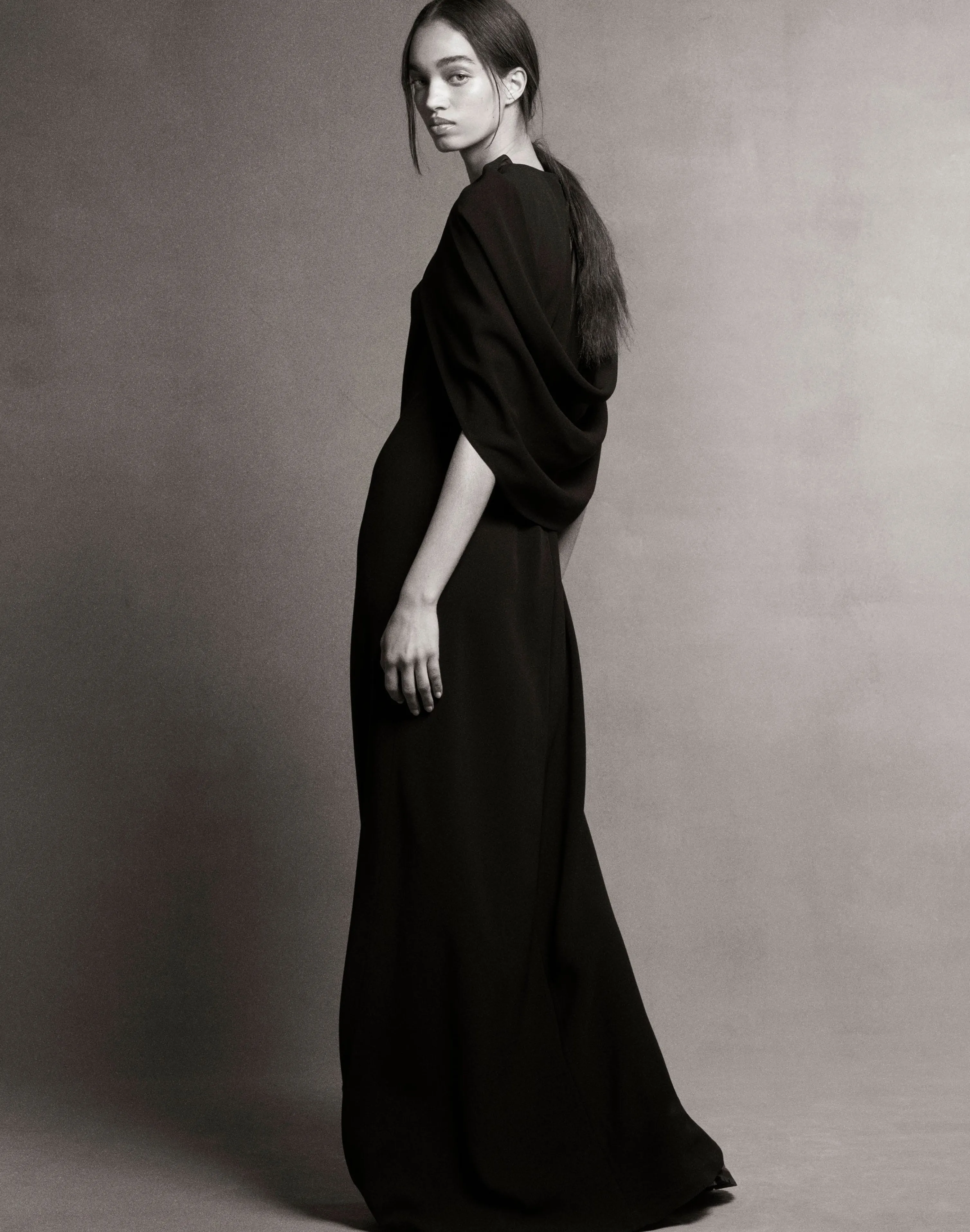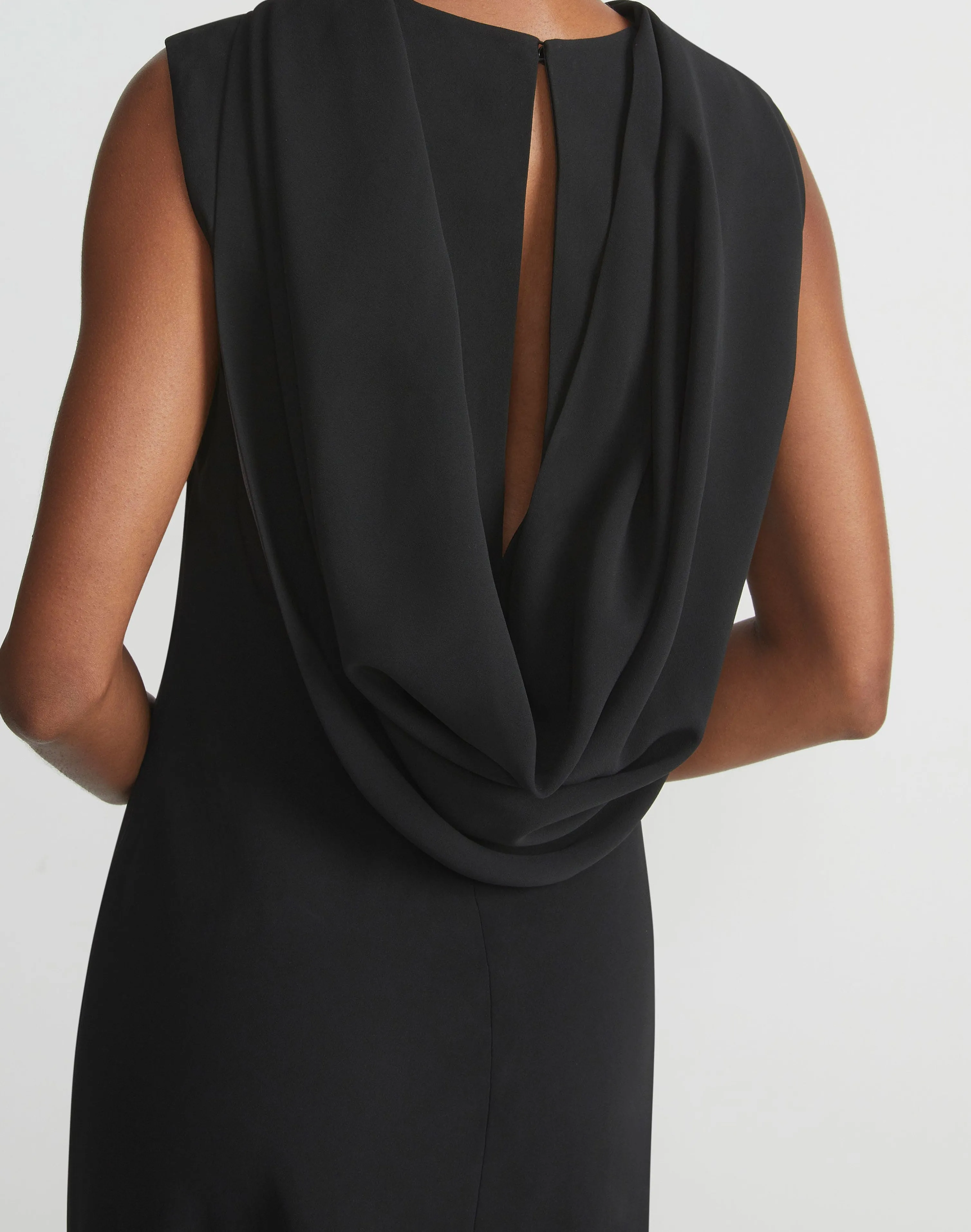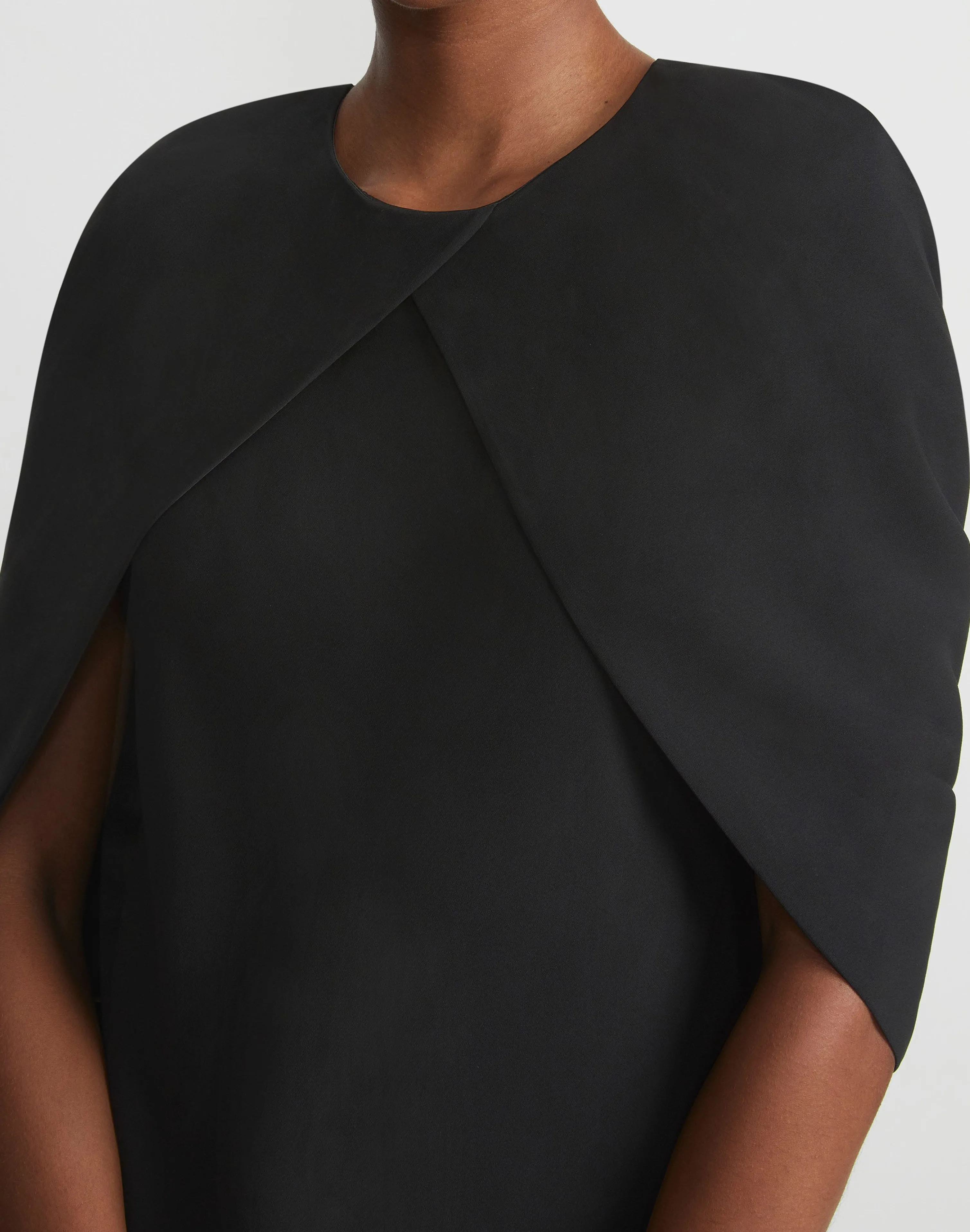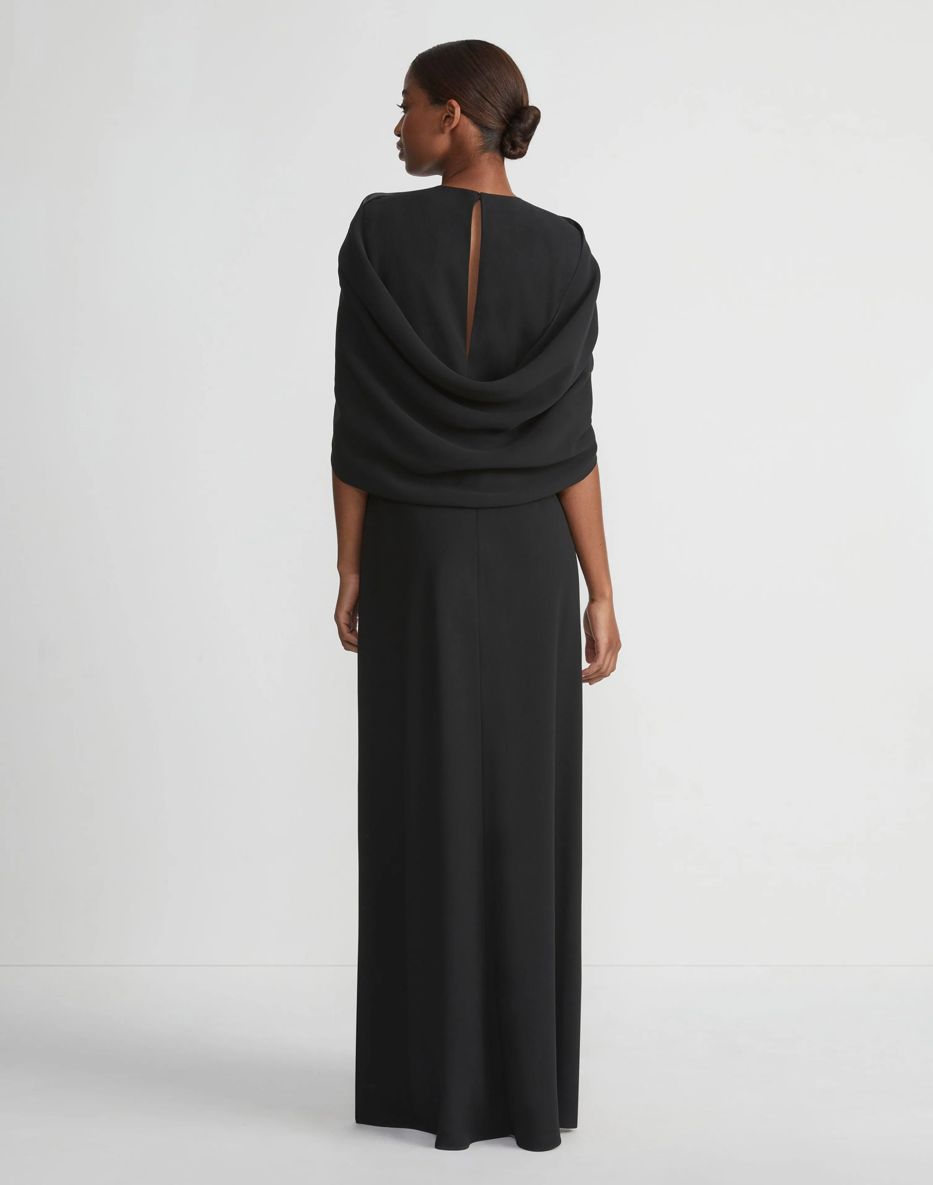 An elegant approach to modern versatility, this floor-length gown is exquisitely bias-cut in fluid Finesse Crepe with a unique shawl design that transforms with ease—draped over the shoulders, slung off the shoulders, and worn as a cape or cowl. The softly contoured fit & flare silhouette features a discreet side-zip entry, with a trim jewel neckline and deep back keyhole reveal.