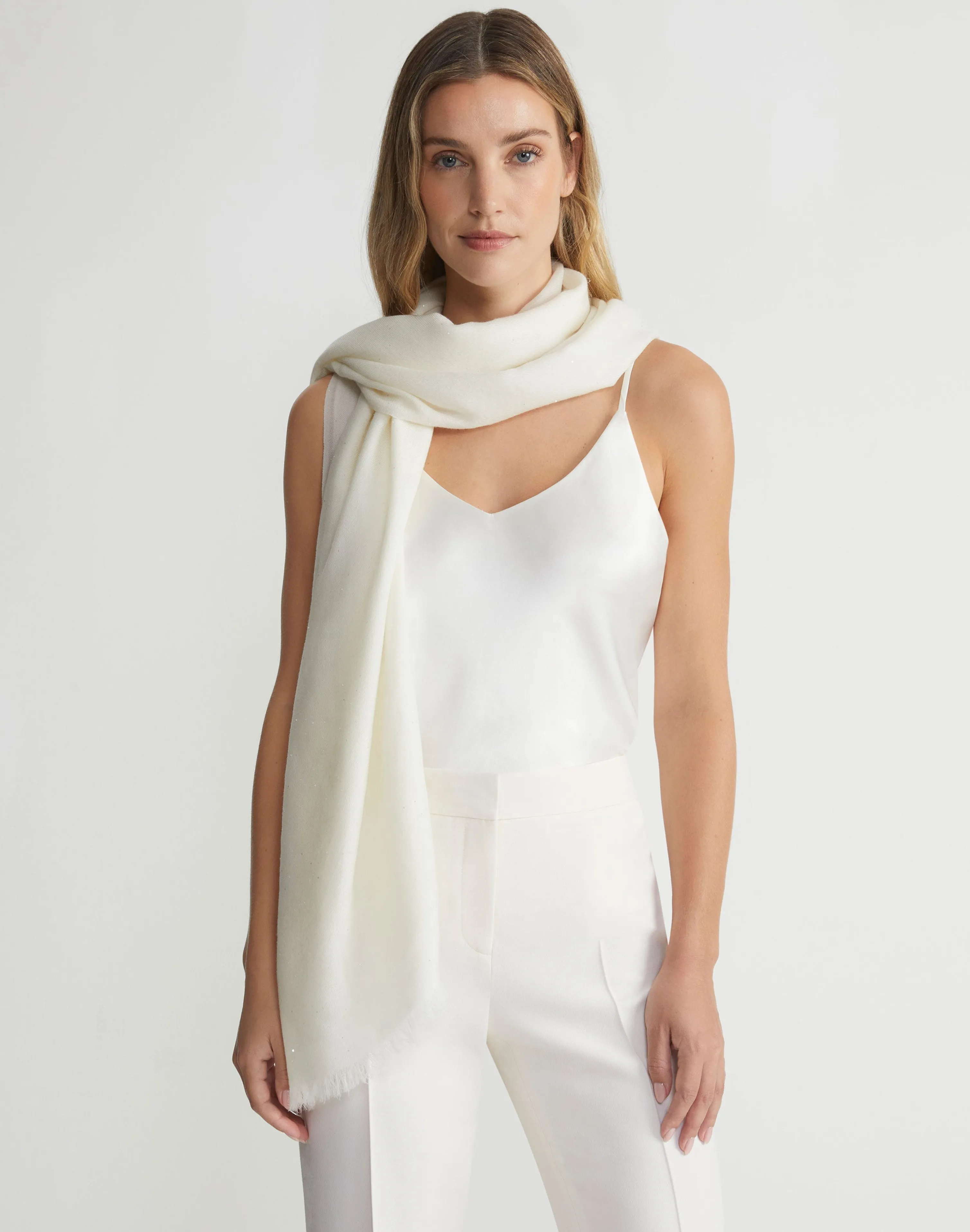 Impeccably crafted from sumptuous Italian wool, this gauzy shawl is artfully detailed with intricate sequin embellishment, adding a touch of the collection’s unexpected shine throughout. Finished with softly fringed edges, the generous shape lends itself to effortless styling.