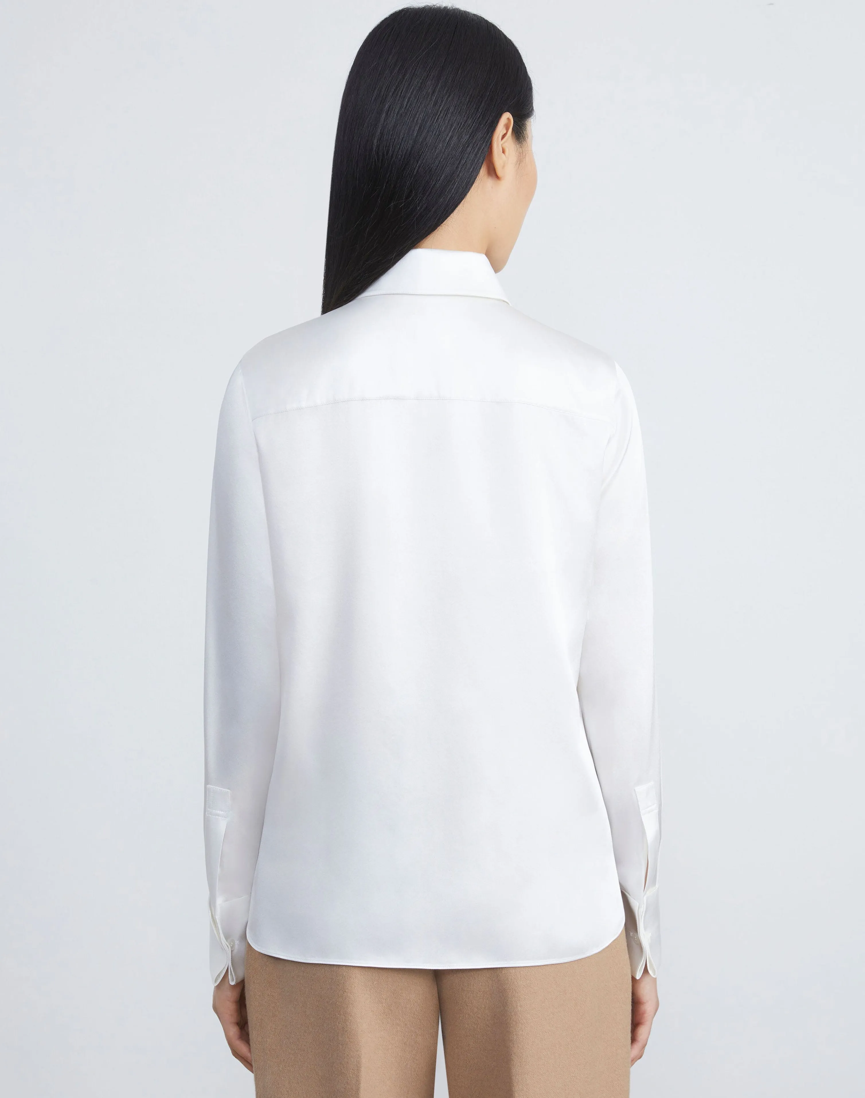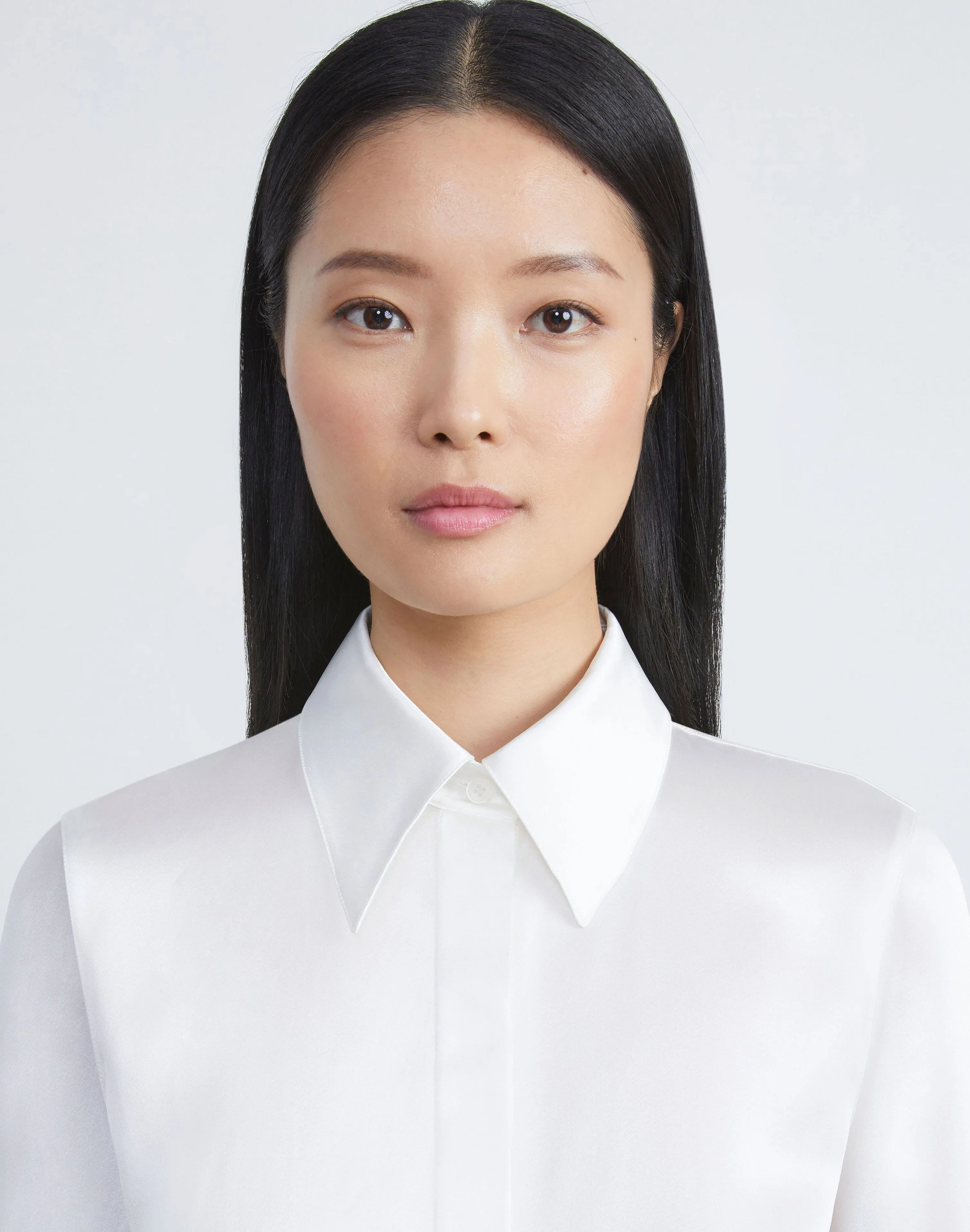 Crafted in luxe, lustrous silk charmeuse, this long-sleeve blouse is cut in a classic, straight silhouette. It’s finished with a sharp shirt collar, button cuffs and hidden front placket, while the elegantly understated design lends modern versatility.