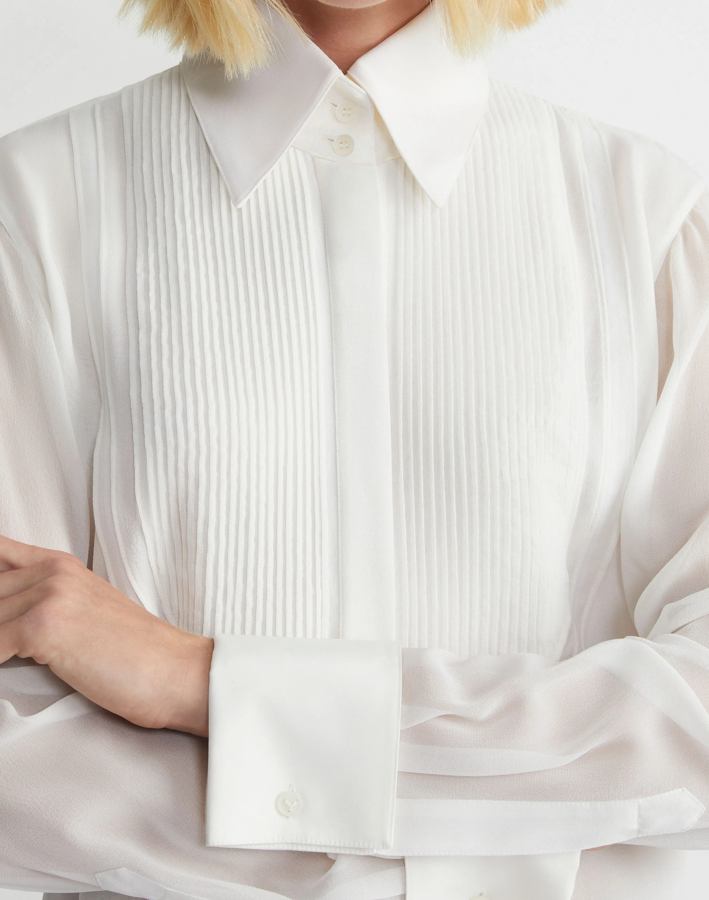 Rendered in airy-light silk georgette, this fluid long-sleeve blouse is defined by intricately detailed linear pintucks at the bib—a textural counter to its gauzy construction. It’s cut in a slimming silhouette with a pointed shirt collar, hidden button placket and polished French cuffs.