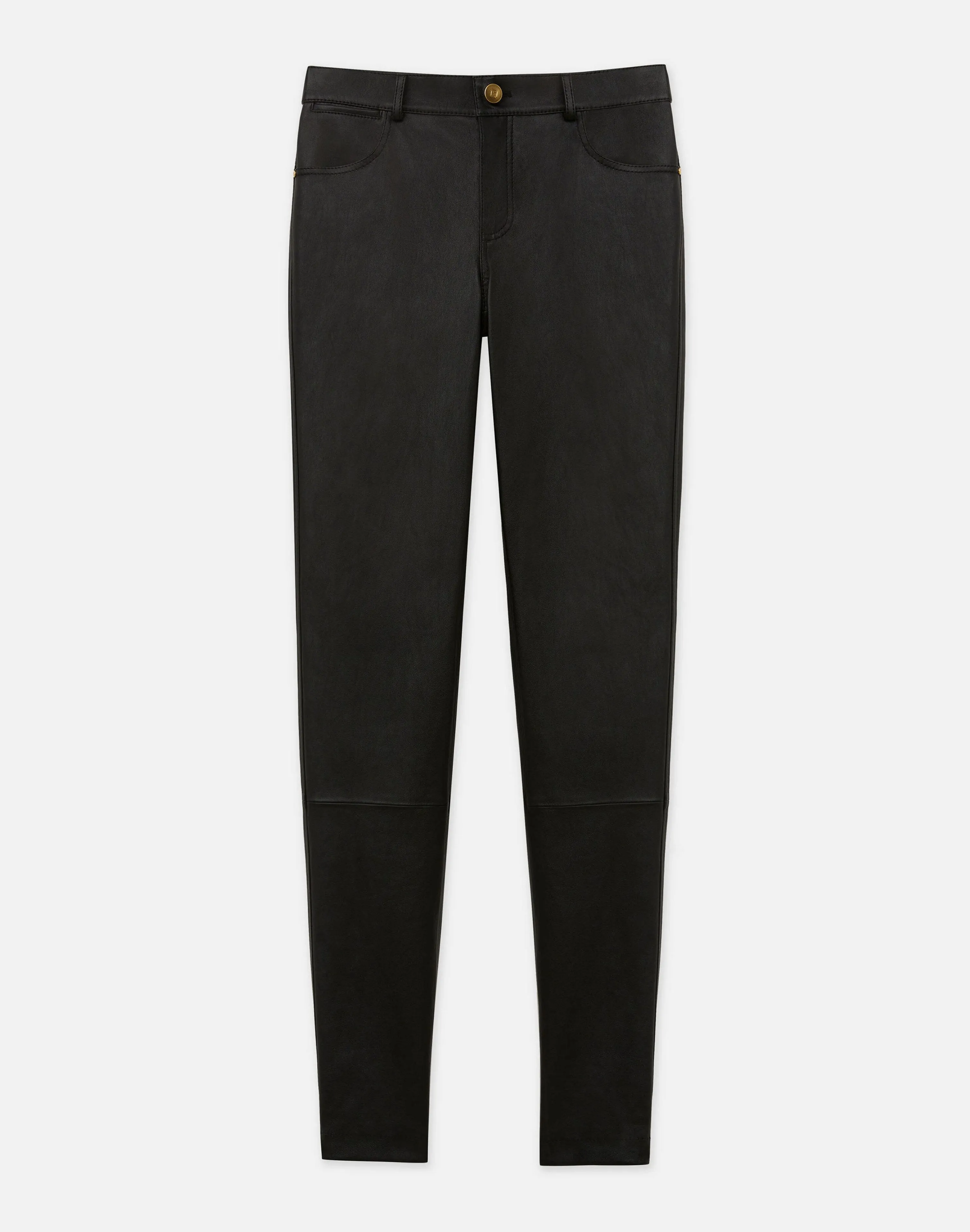 Masterful construction and luxurious materiality come together in the Mercer pant, expertly cut from smooth nappa lambskin leather infused with stretch for a flawless fit. This pair sits slightly below the waist with an ultra-slim leg that’s cropped at the ankle and finished with classic denim details: jean-style pockets, rivet hardware and topstitched seams.