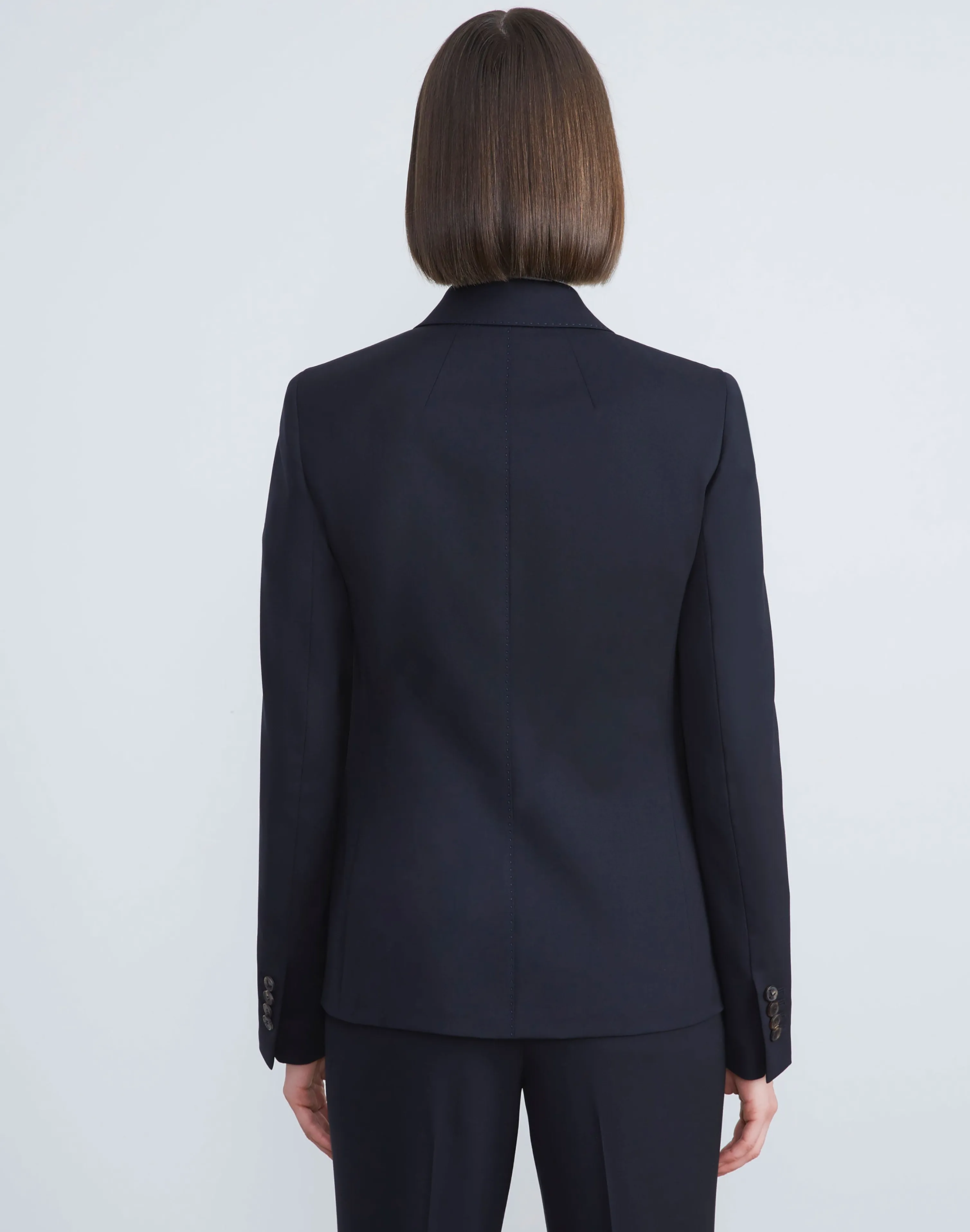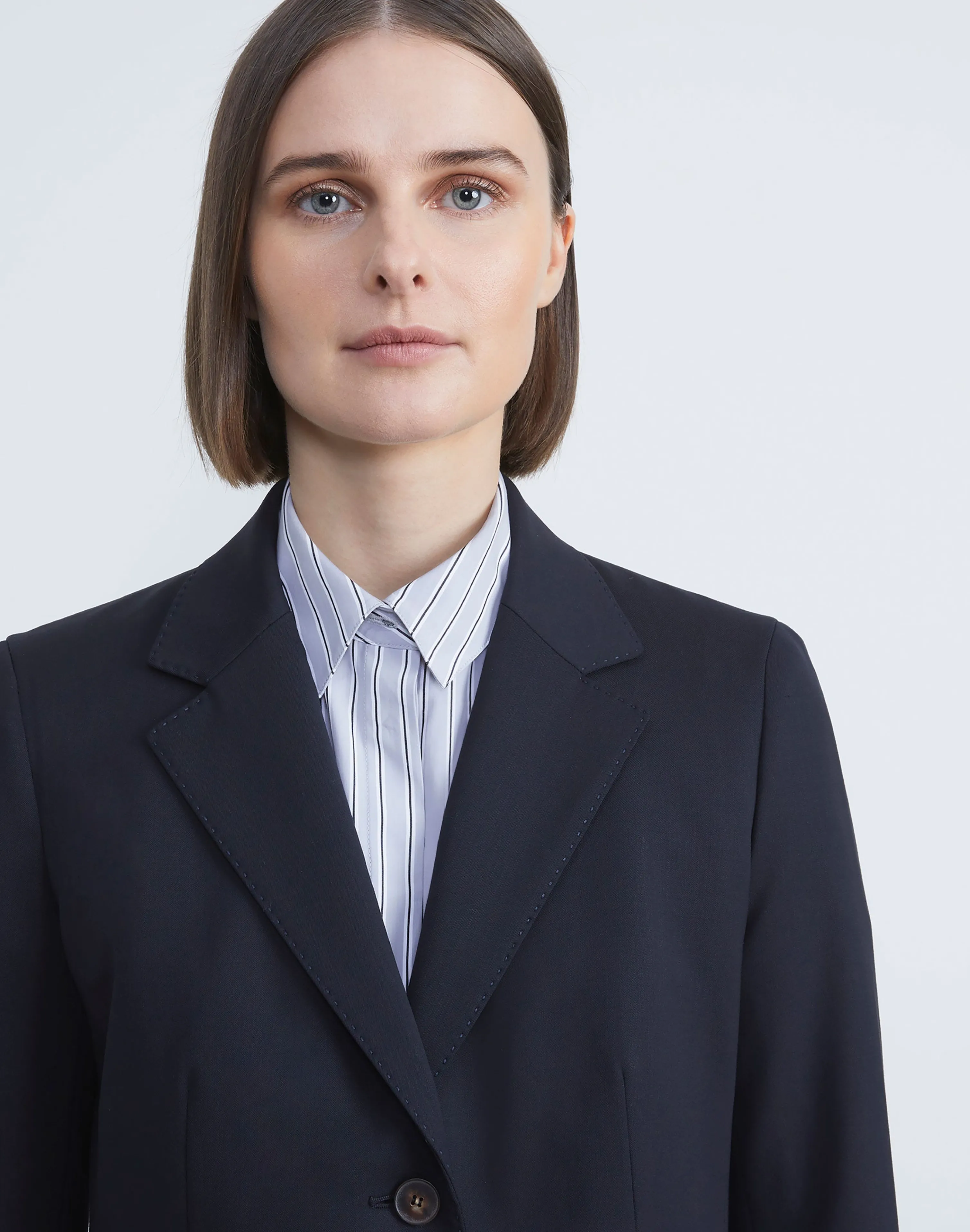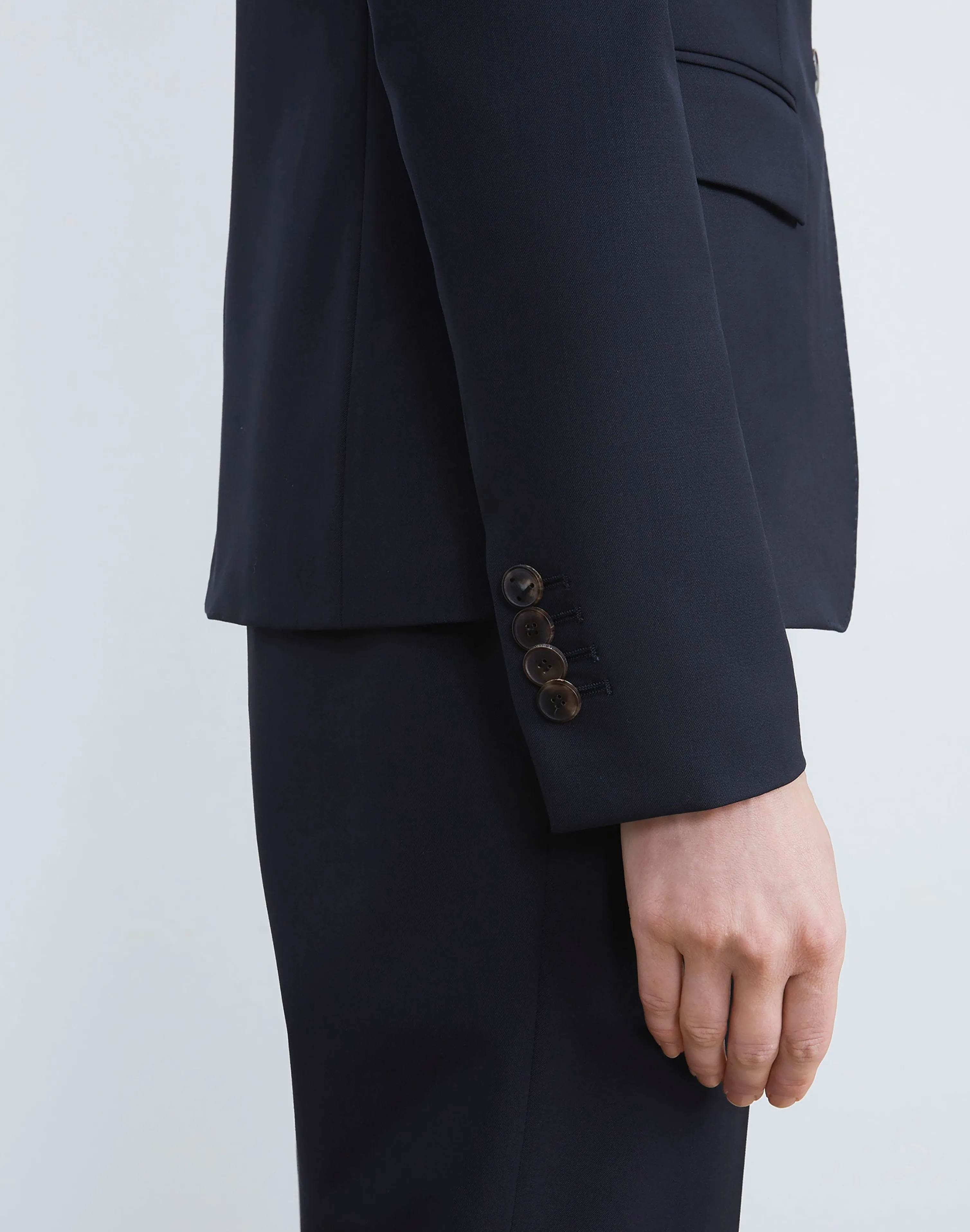 Combining modern structure and perfected proportions, this two-button blazer is expertly crafted from Italian wool yarns blended with just enough stretch for comfort and resilience. The tailored silhouette is defined by lightly structured shoulders and architectural lapels.