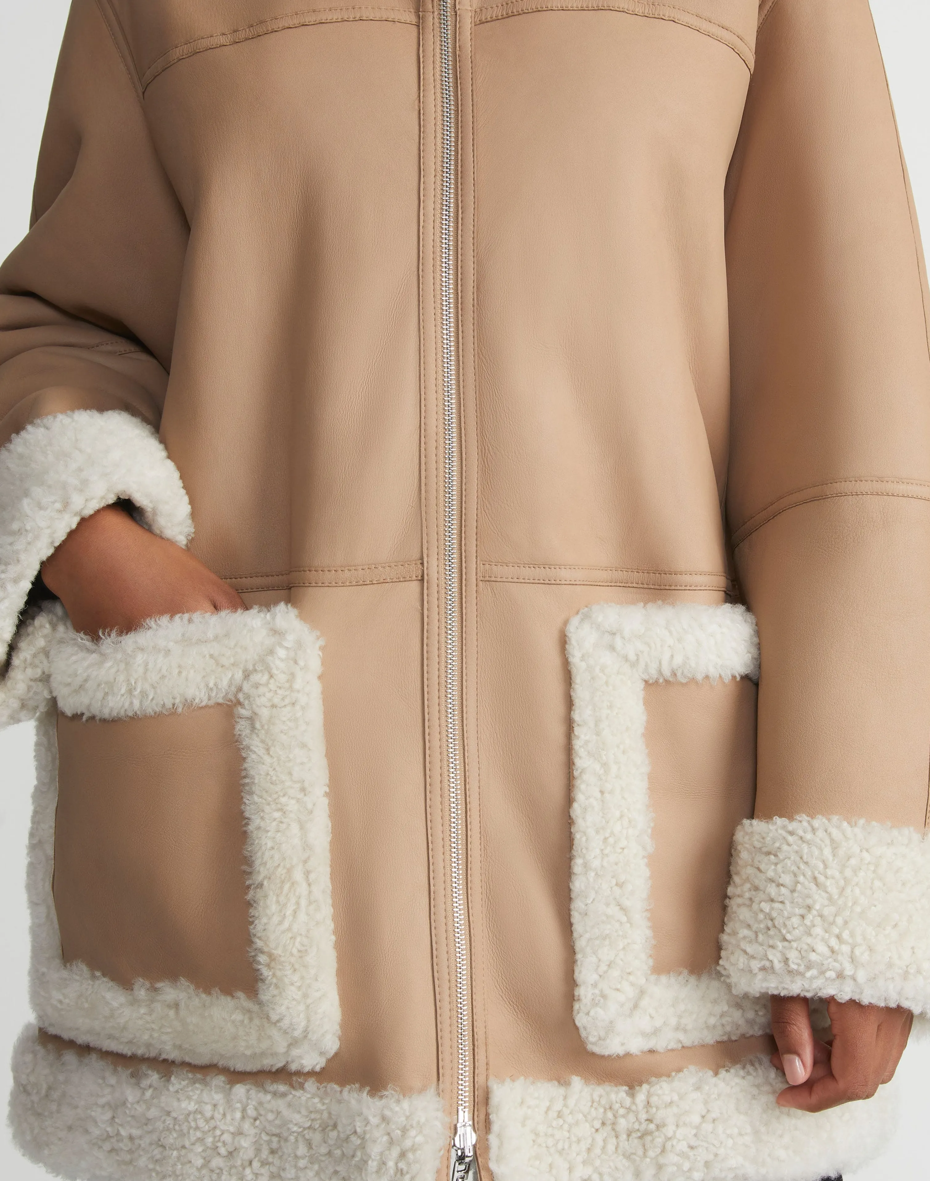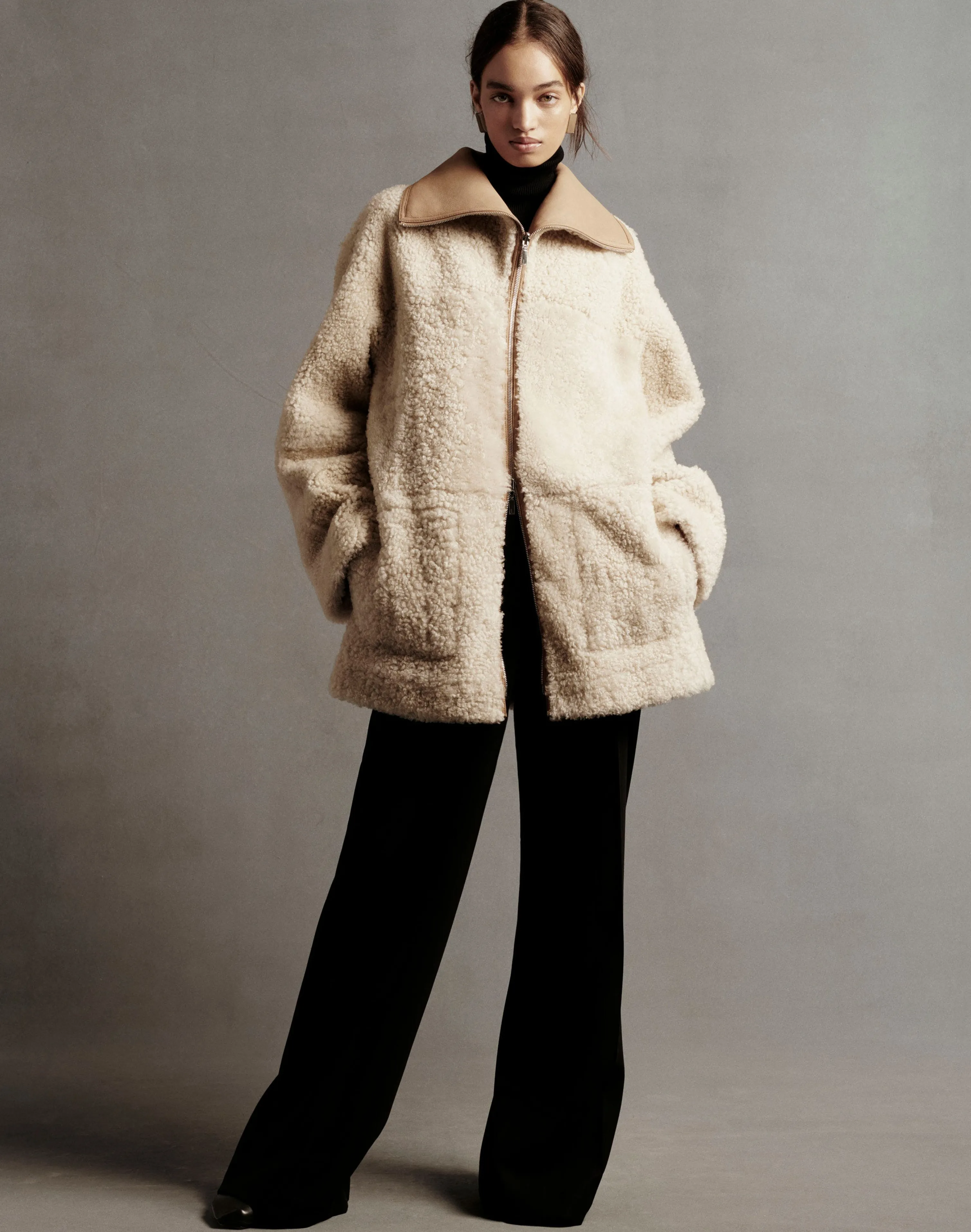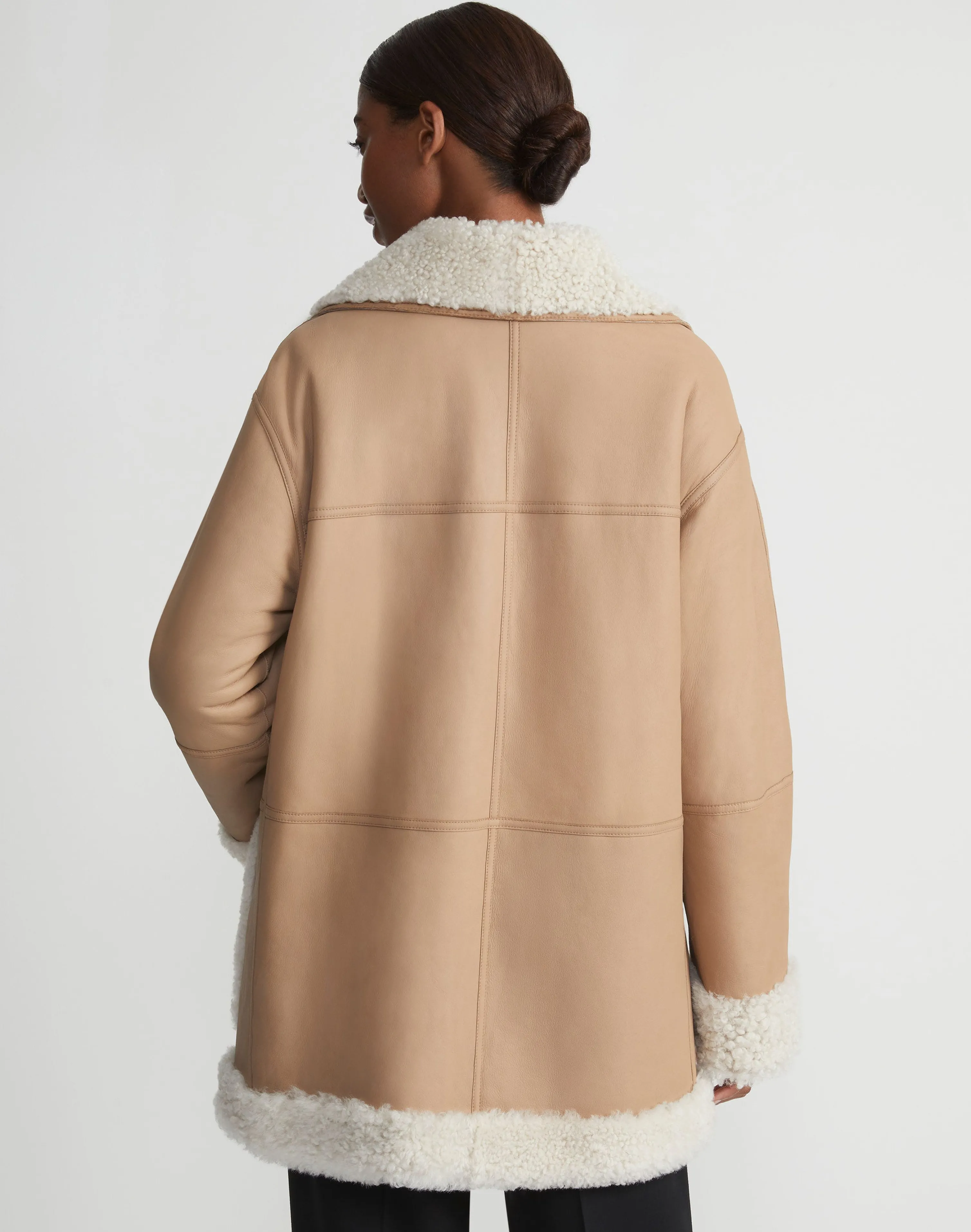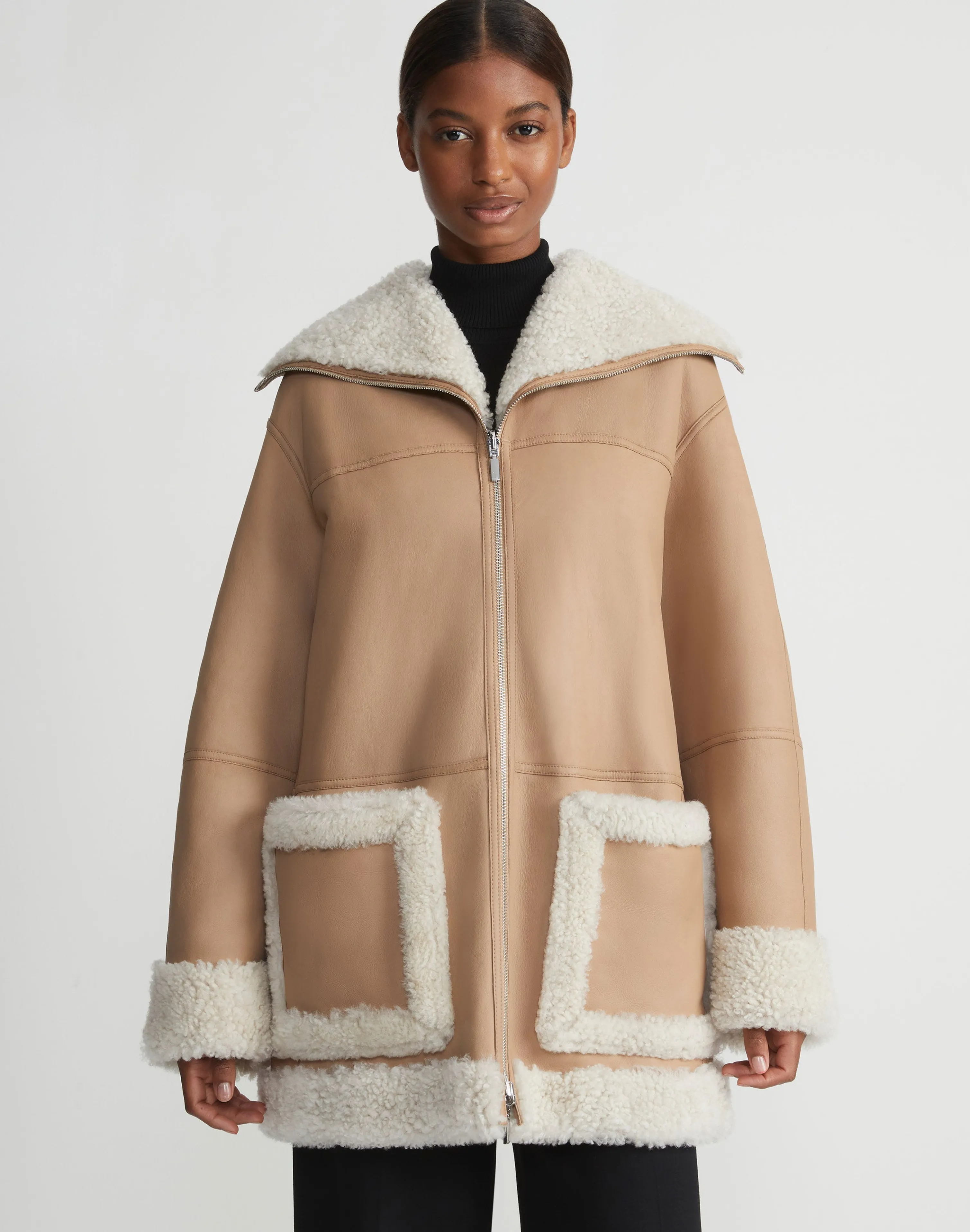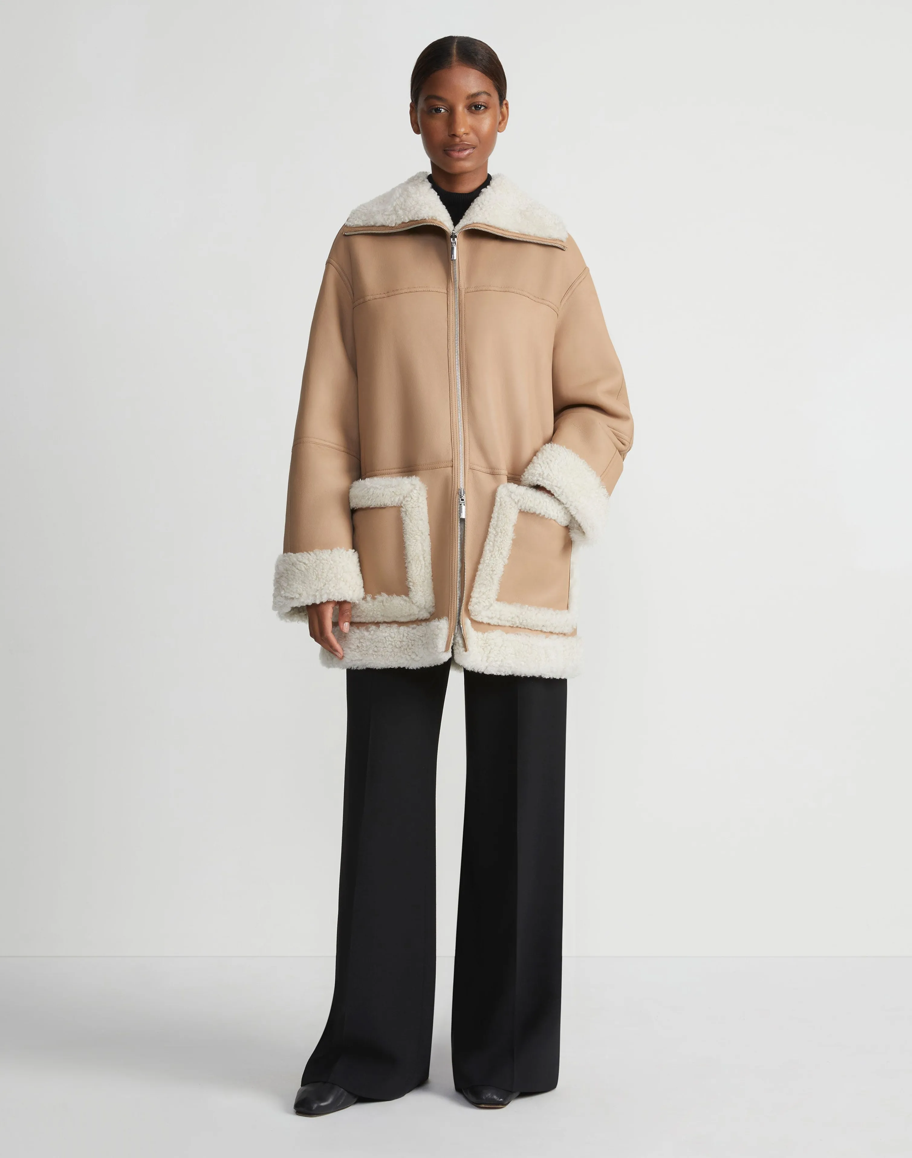 Transposing Resort 2024’s cozy, Upstate aesthetic through the rich tactility of natural fibers, this softly flared, A-line coat is expertly crafted from luxurious lamb shearling in a convertible design that reverses from plush, wavy curls to supple lambskin—finished with the House’s signature hand-painted leather edges. Relaxed, drop shoulders lend an at-ease aesthetic, while dual zipper closures transform the shawl collar to an enveloping funnel neck, offering multiple ways to wear.