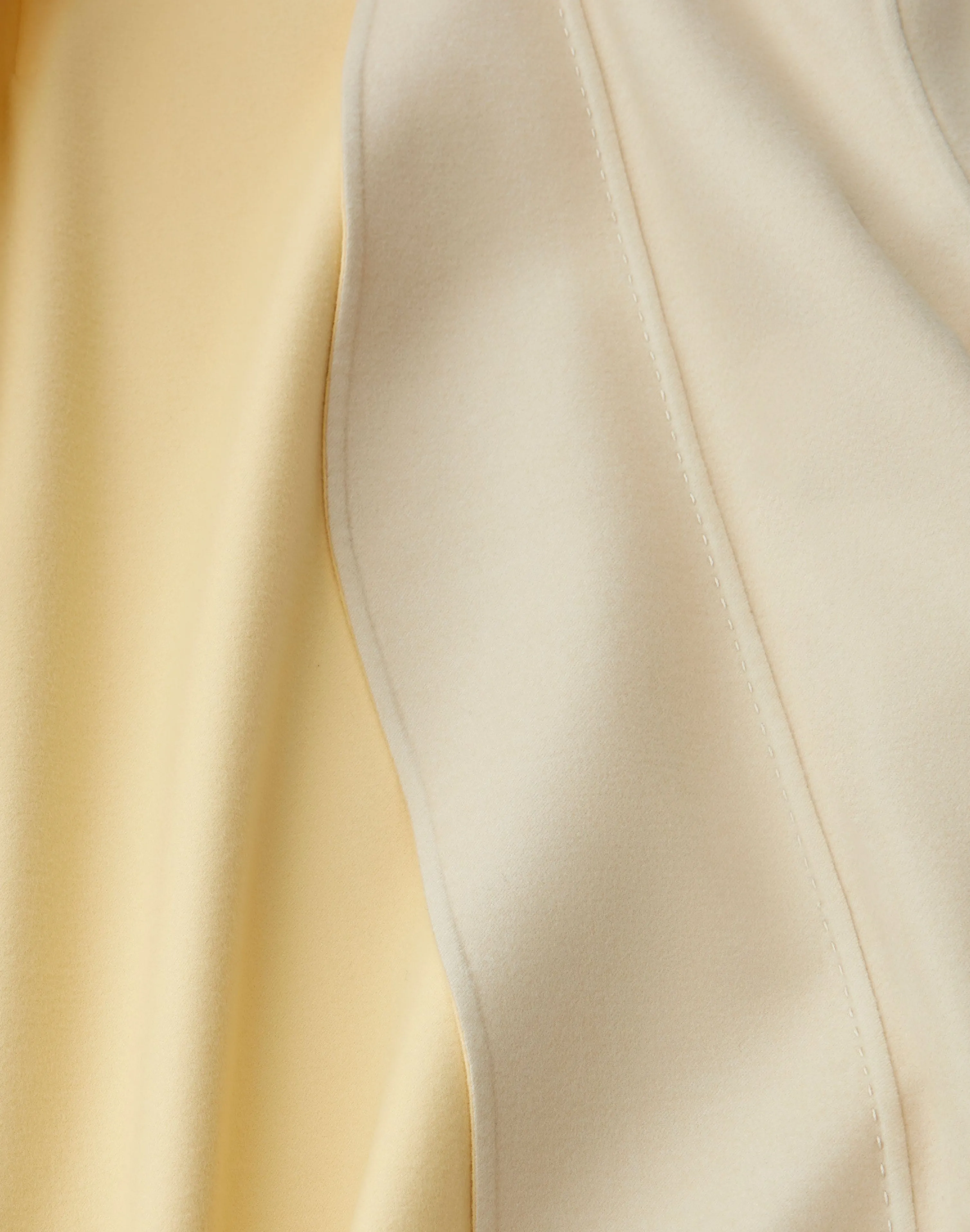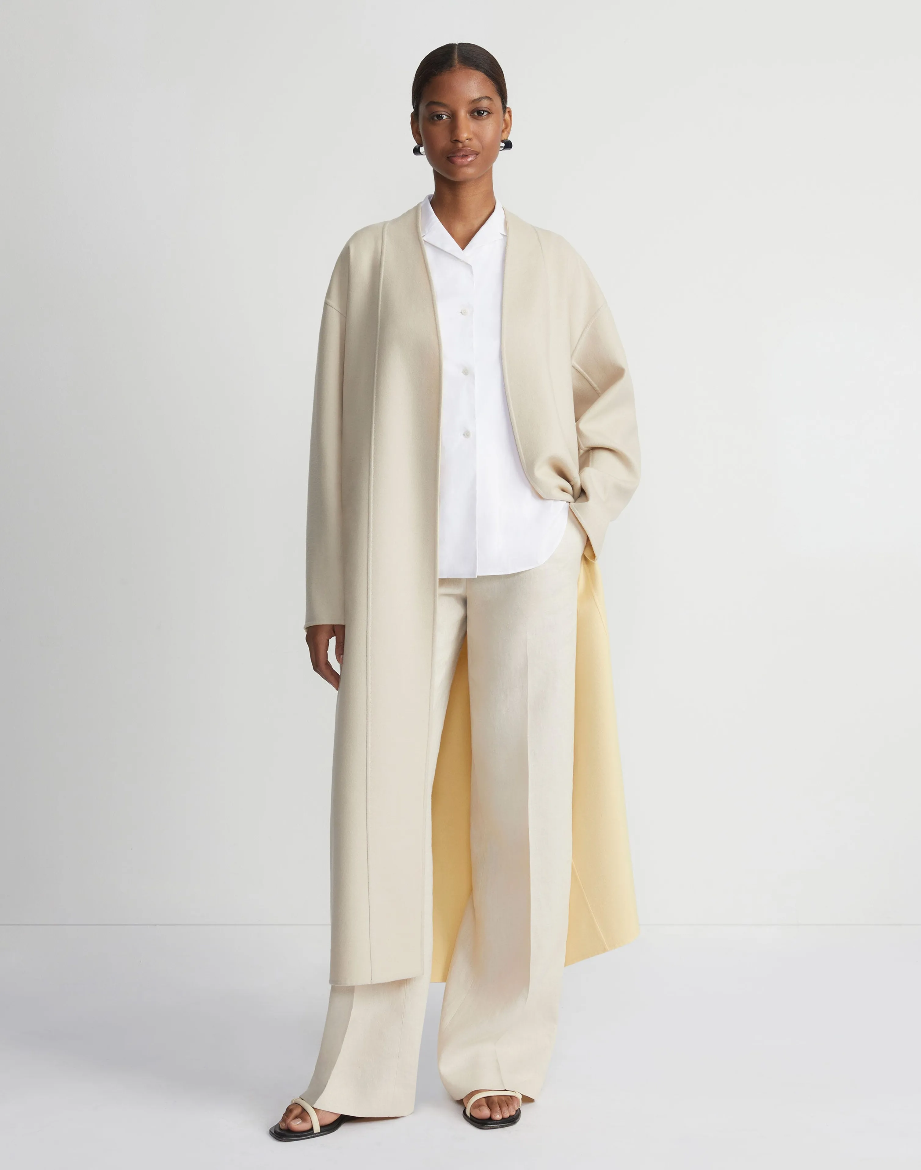 A masterclass in artisanal craft in fabric sourced from Loro Piana’s world renowned mills, L148’s two-tone double face coat embraces Spring 2024’s urban garden palette, with two shades of sumptuously light Italian wool-silk intricately woven together with hand-closed seams to achieve a flawless, reversible finish. The V-neckline continues through an open-front design, while contouring princess seams and drop shoulders lend soft structure to the straight shape.