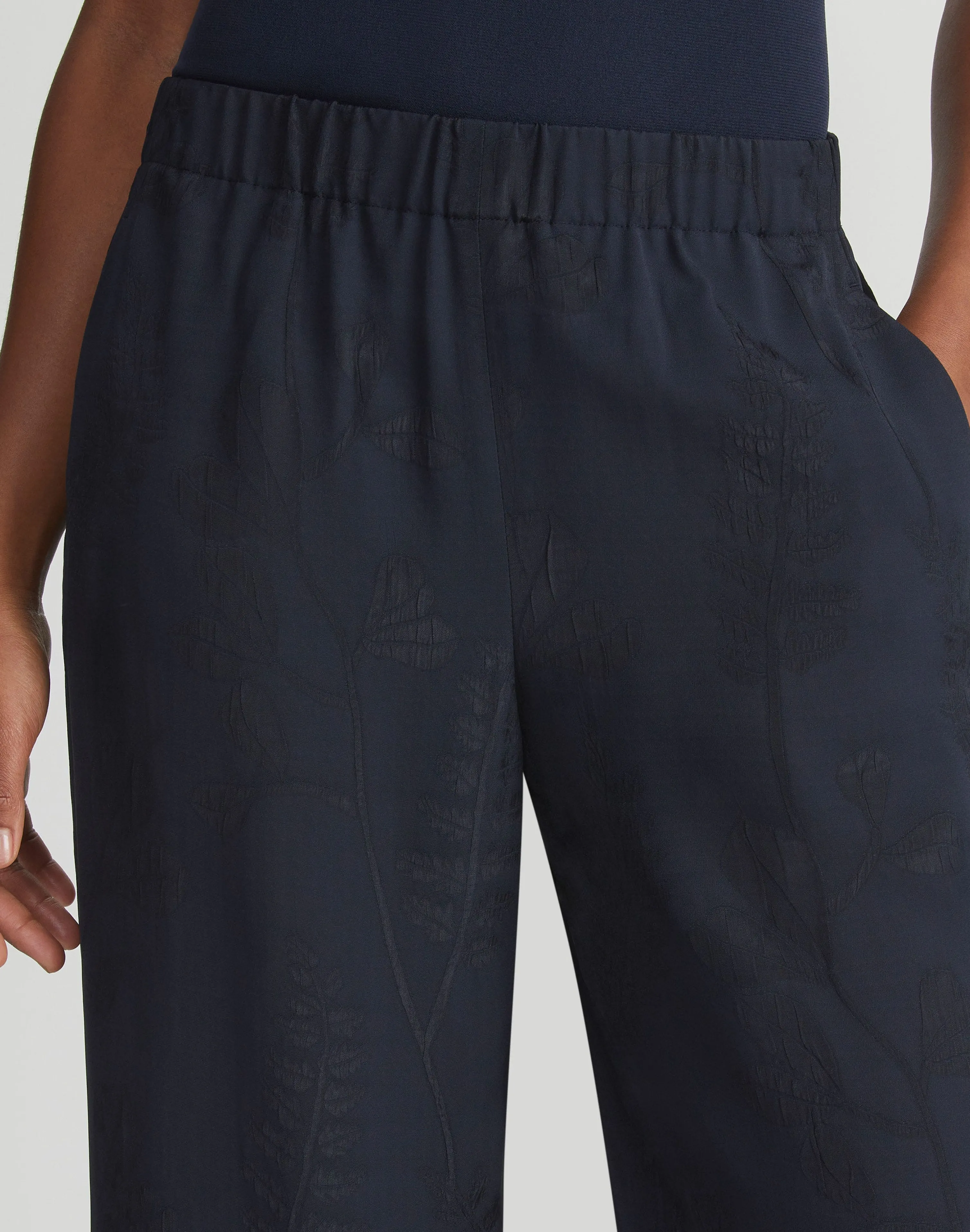 Artisanal design is met with relaxed tailoring in this iteration of the Riverside pant, rendering the Resort 2024 collection’s Floral Bloom motif through a dimensional cloqué jacquard in fluid Italian viscose. The full, wide-leg silhouette is complemented by an effortless elasticized waistband, slip pockets and clean-finished ankle hems.