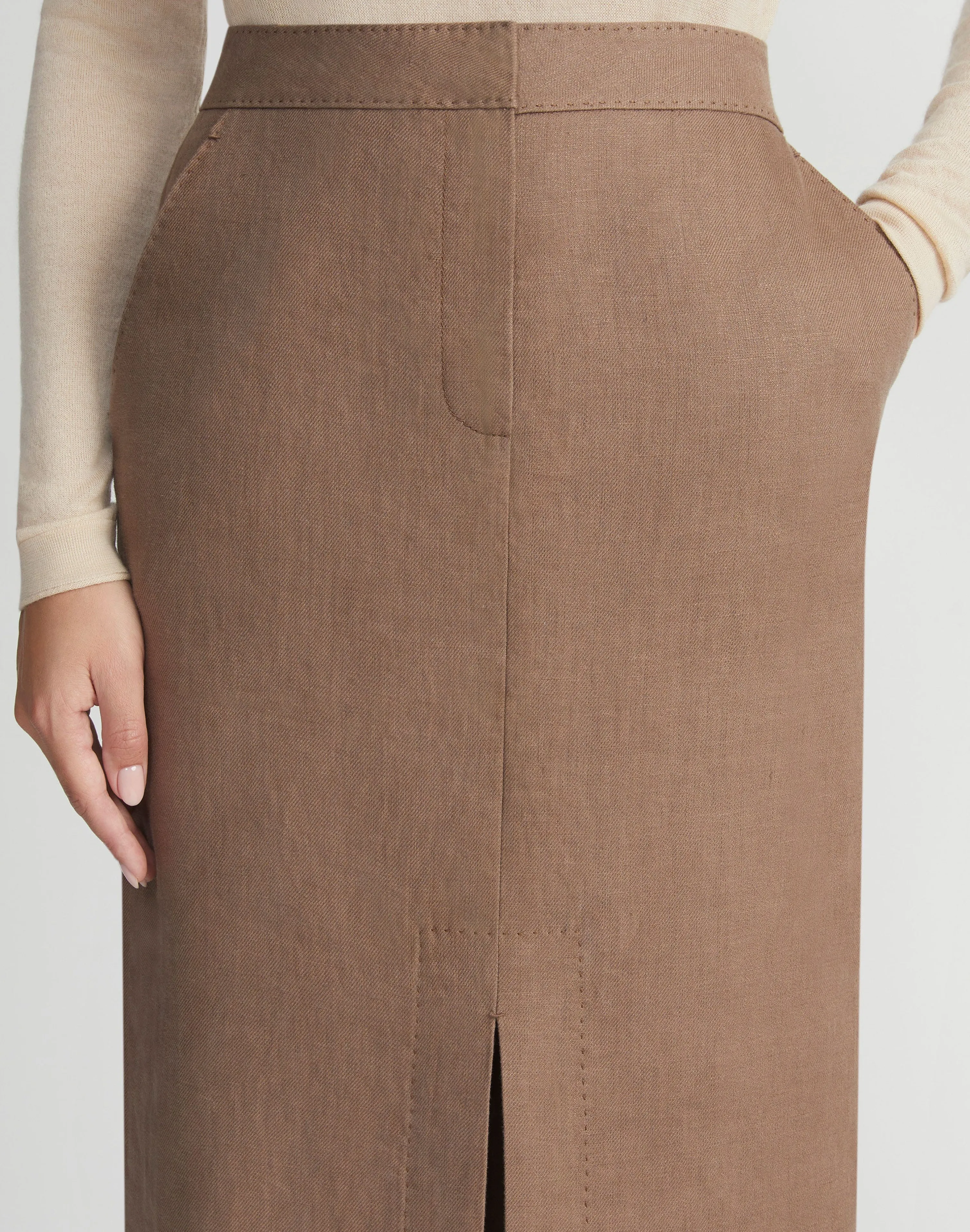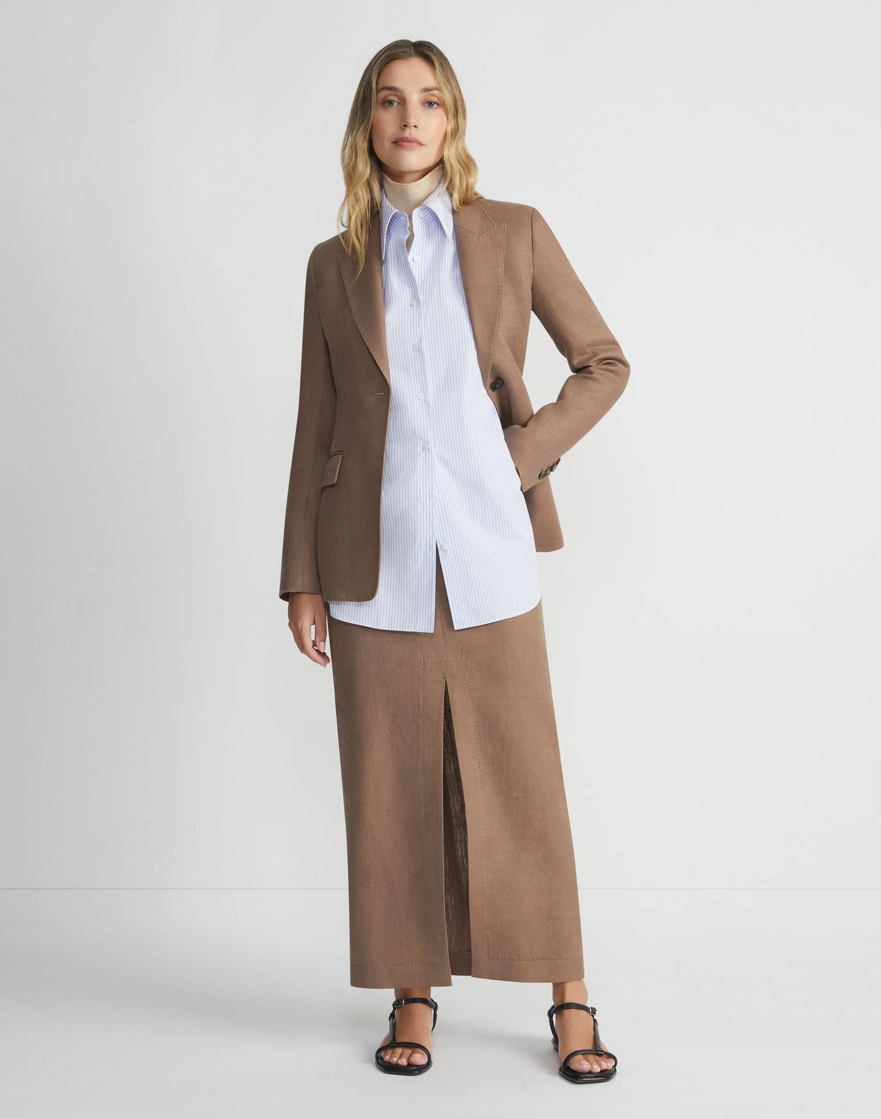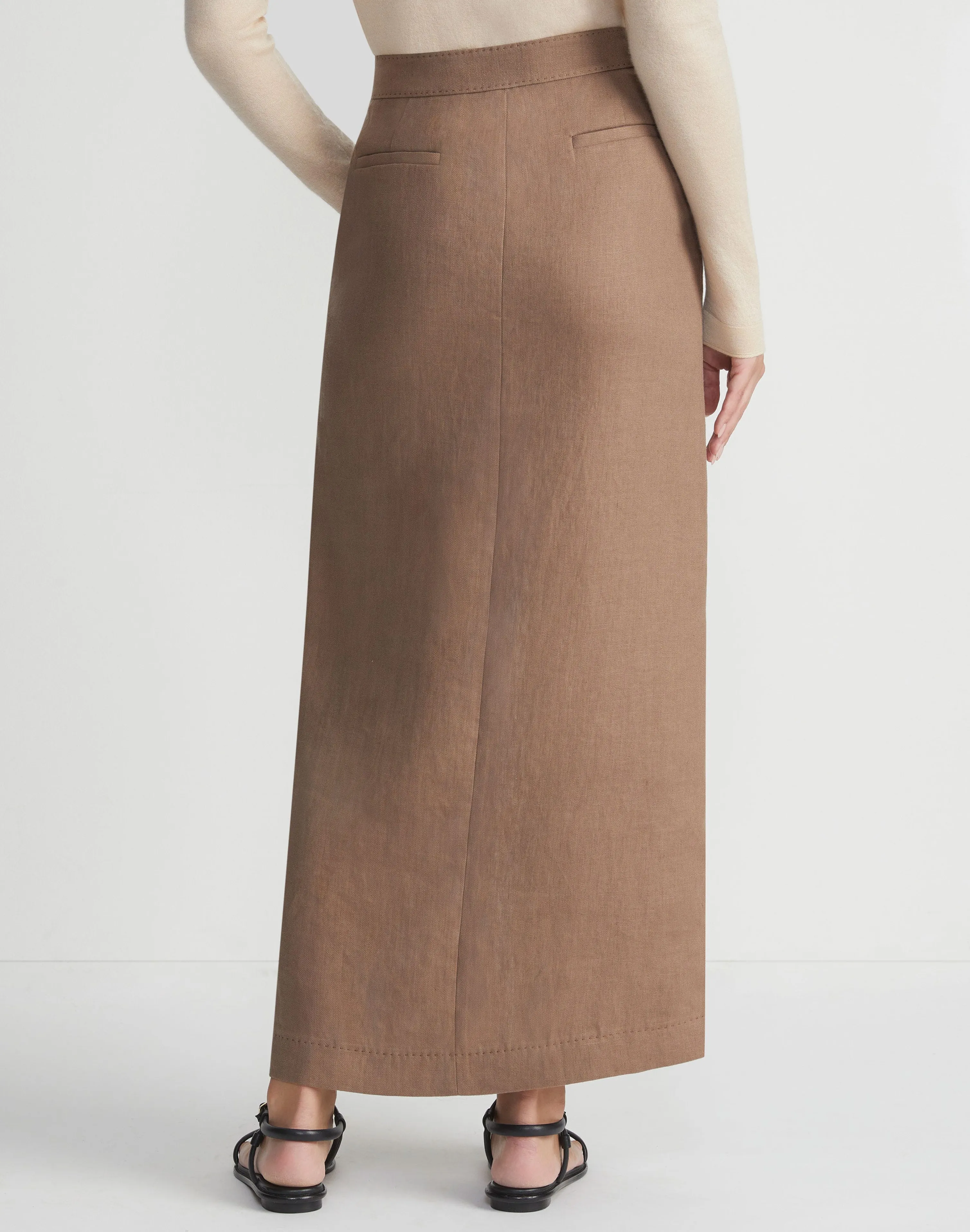 Feminine cutlines couple with the House’s utilitarian codes in this softy structured maxi skirt, flawlessly cut from naturally lightweight, pure linen. The ankle-length design sits at the waist with contouring darts and falls to a straight silhouette, offset by a high center slit.