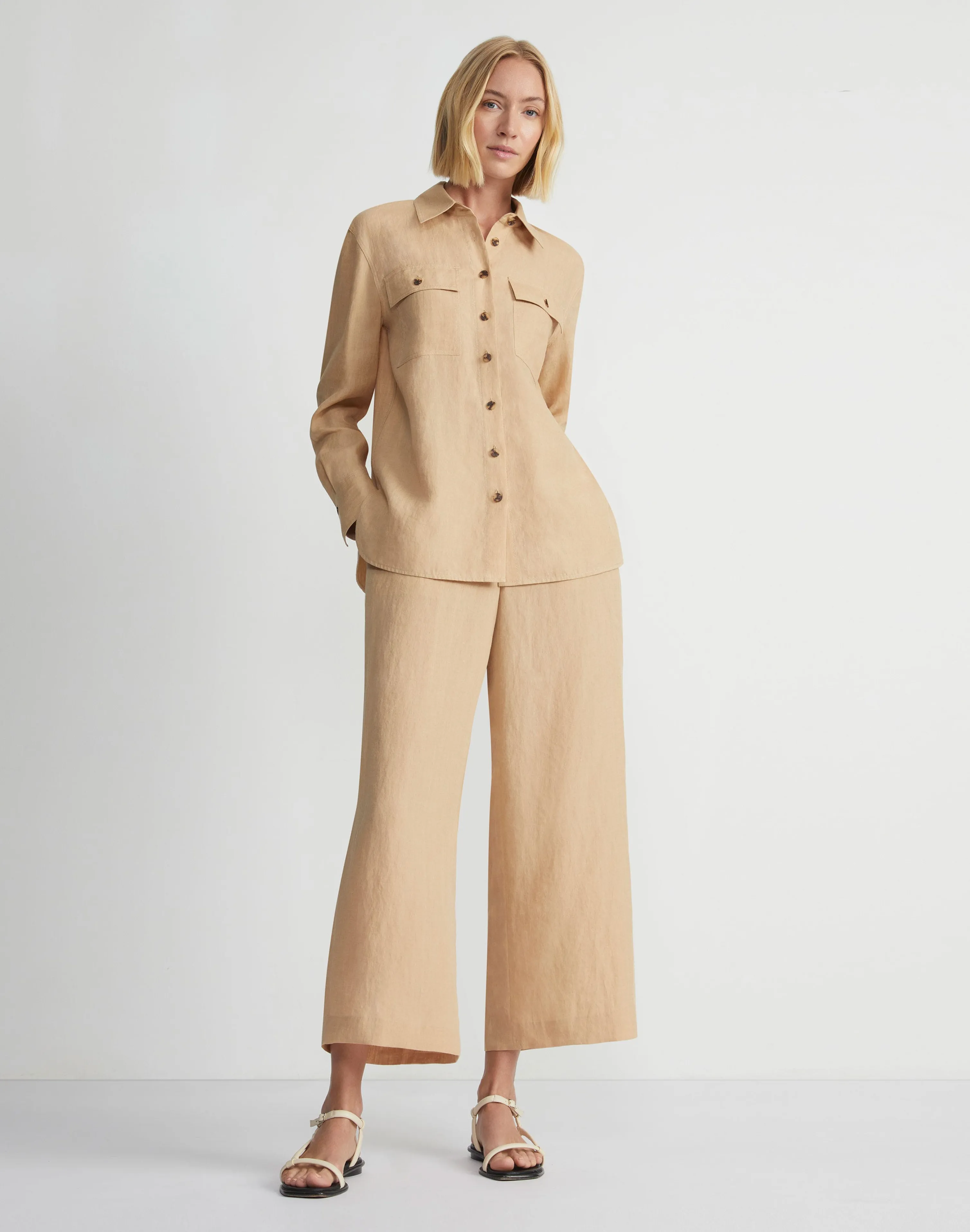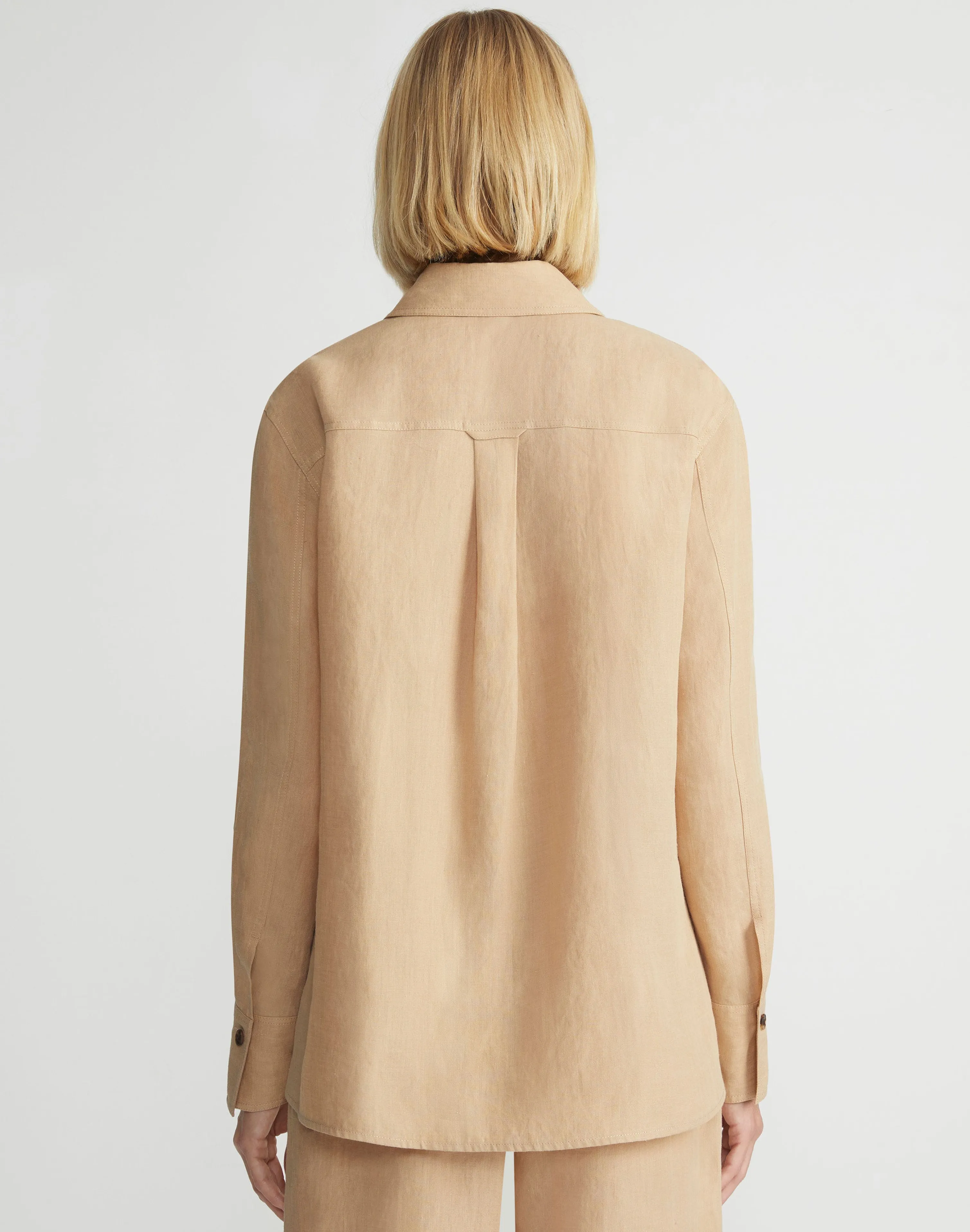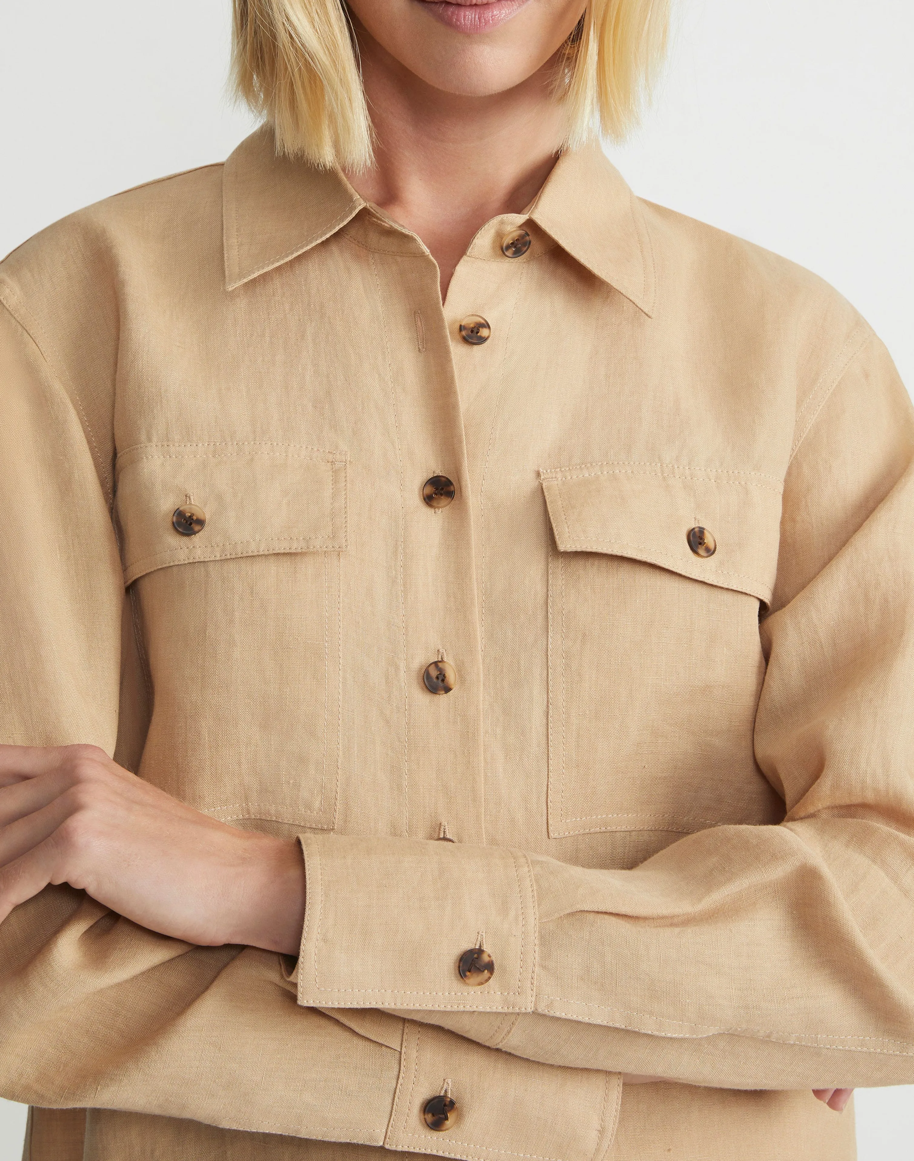 Crafted in airy, organic linen, this shirt jacket makes layering effortless with a relaxed, straight shape and polished finishes. It’s defined with a sharp collar and workwear-inspired patch front pockets.