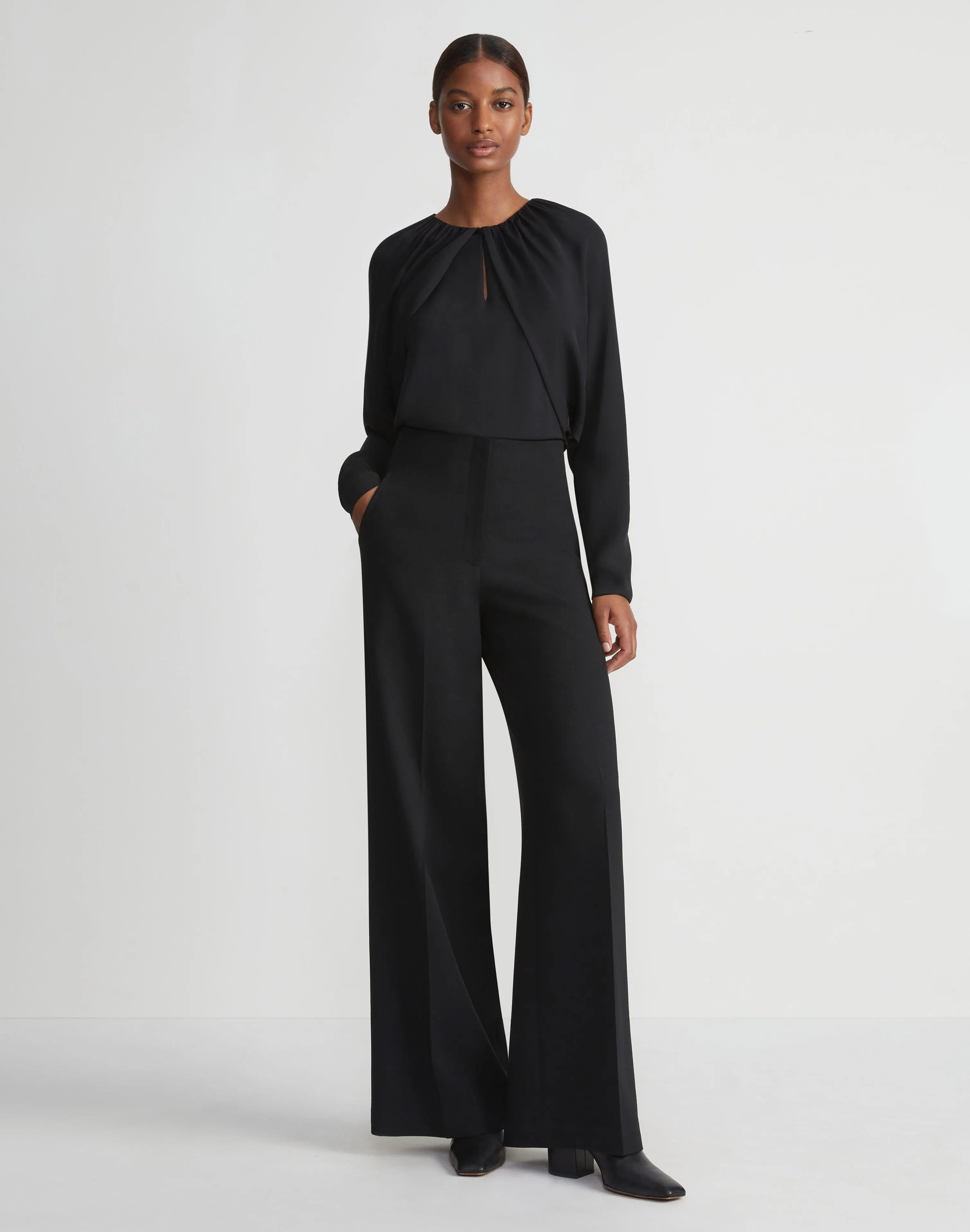 A intelligent approach to eveningwear, this versatile piece renders the classic bolero and blouse in one, masterfully crafted with a caped, long-sleeve overlay design in immaculately fluid organic silk georgette. Gathered shirring along the front and back necklines adds soft volume through the straight silhouette, while the keyhole front adds a subtle, unexpected reveal.