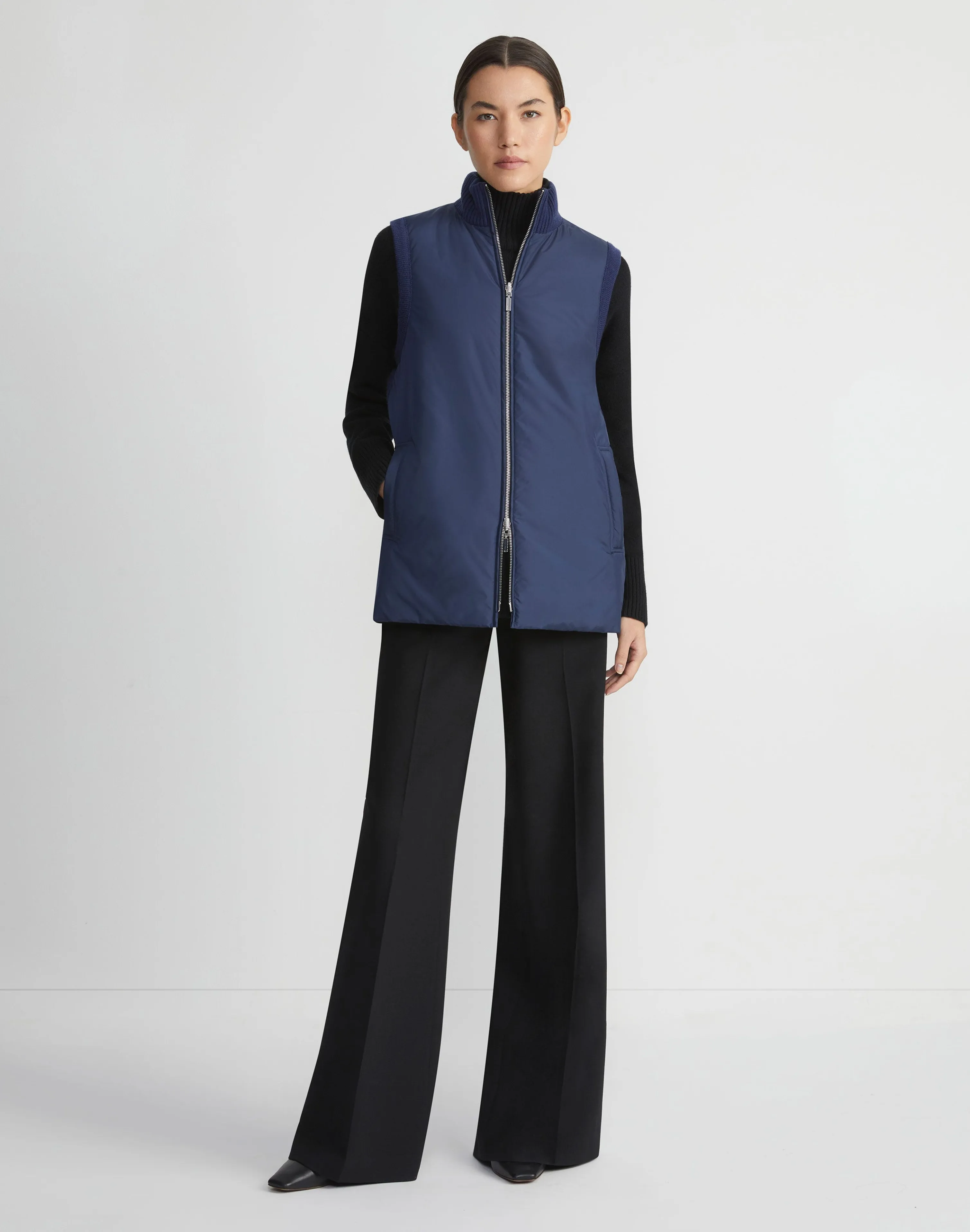 This reversible vest combines soft knitted wool, insulating lofty warmth and a sleek, technical shell rendered from recycled poly-fibers. The straight-cut design is accented with cozy ribbed trim and tapers with an elasticized drawcord, while L148’s dual-zip closures—tipped with logo pulls—offer signature versatility.