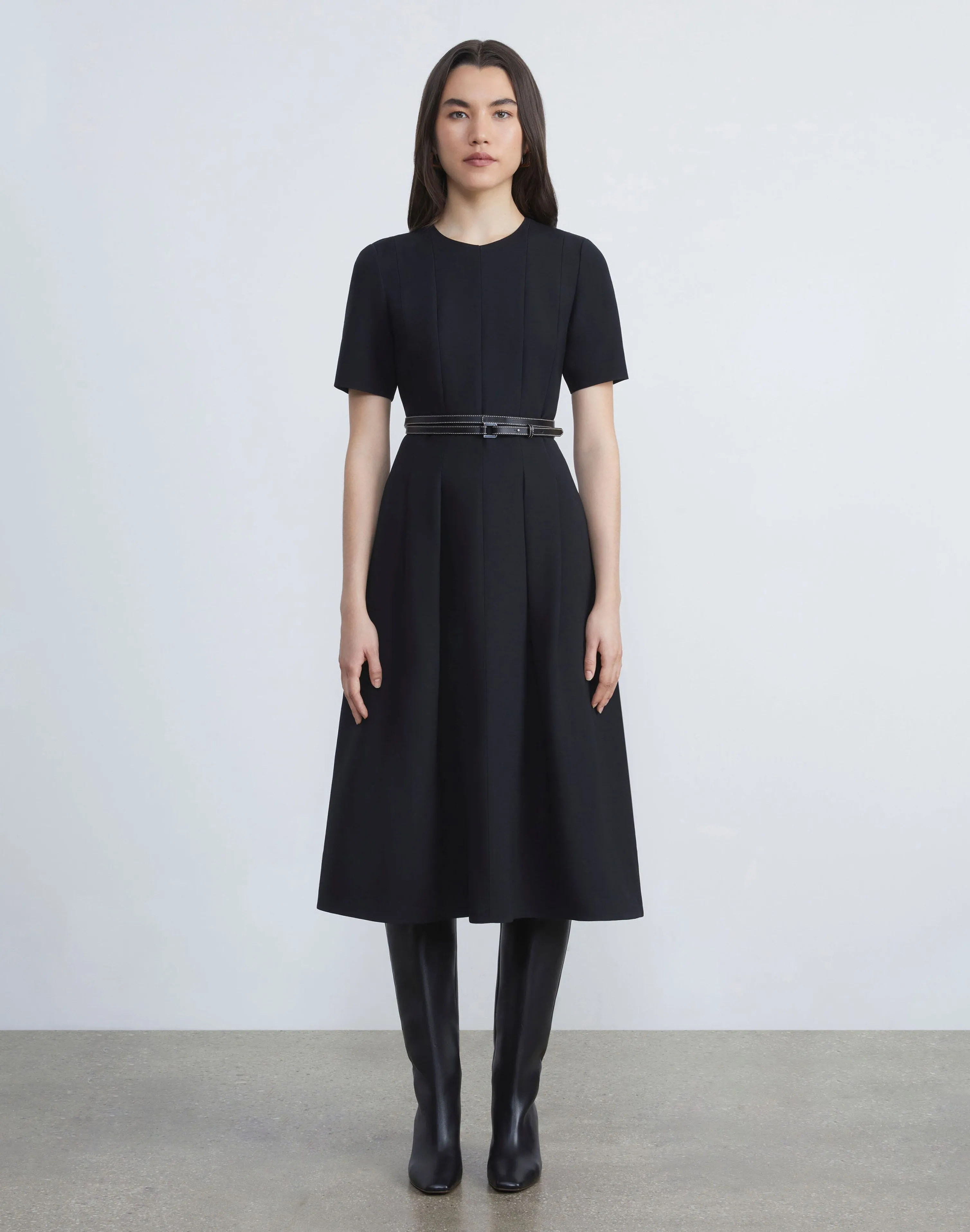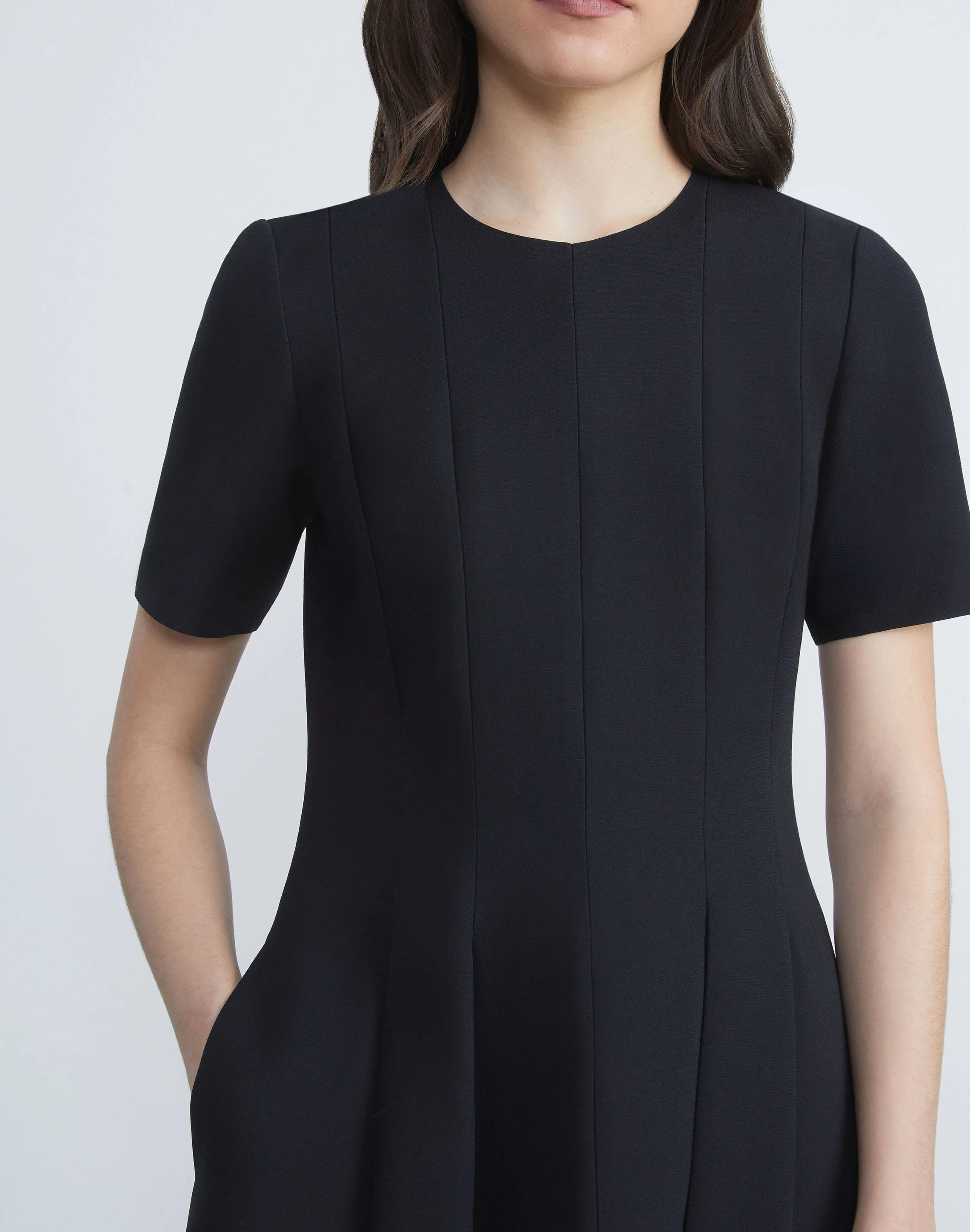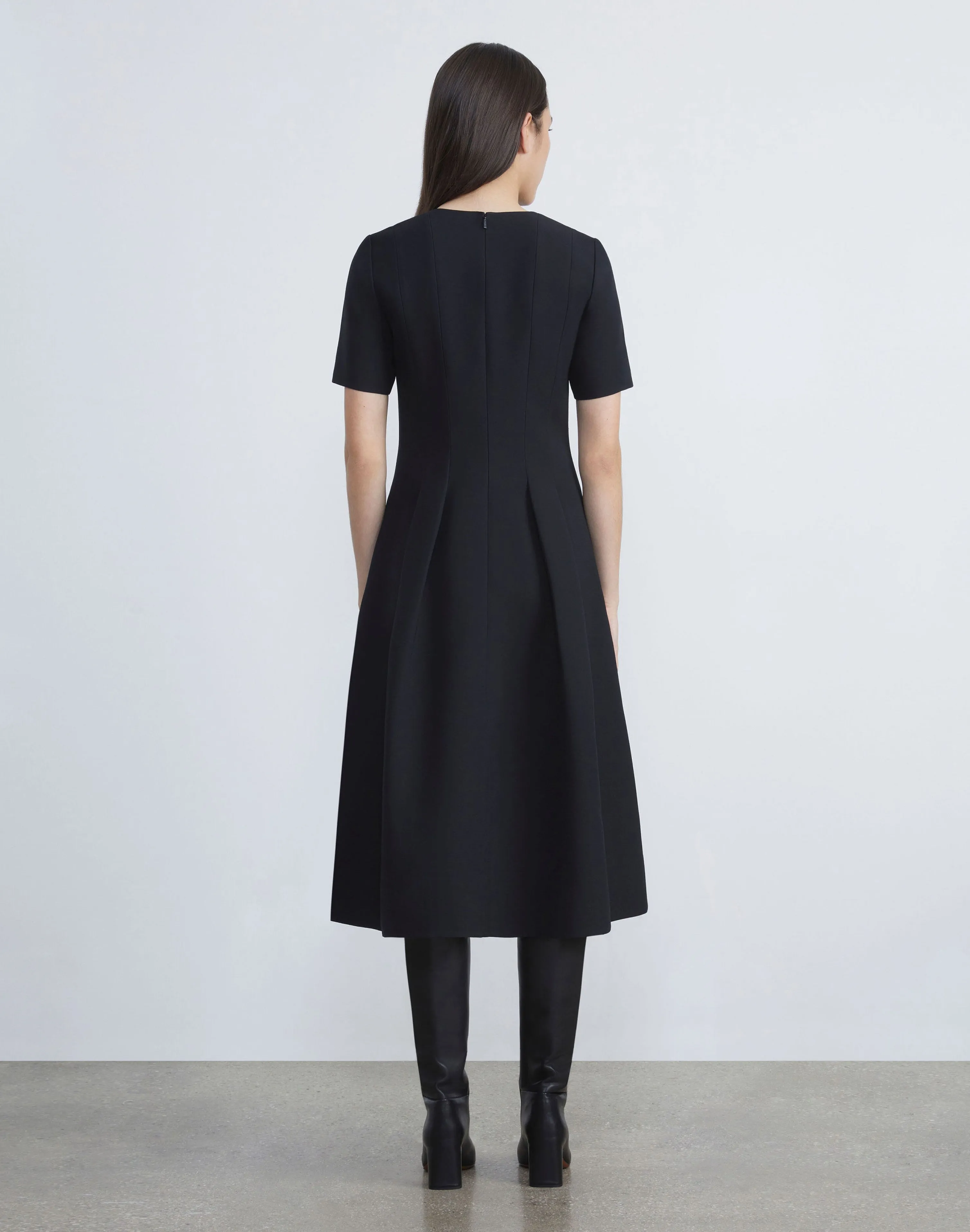 This short-sleeve dress is expertly tailored from tactile wool-silk crepe in a sculptural, flared silhouette gathered by linear pleats. The minimalist design features a curved, jewel neckline and falls to below the knee.