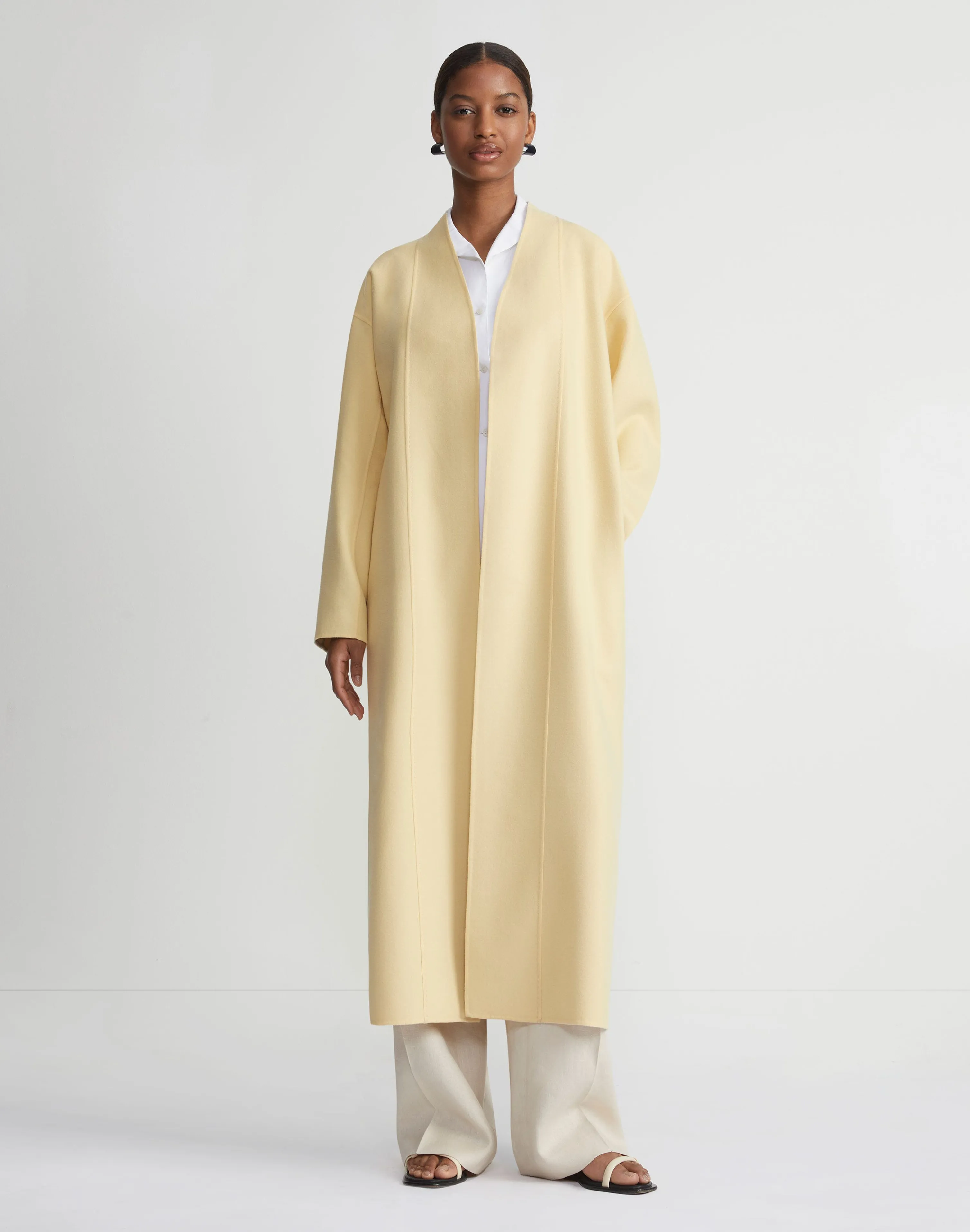 A masterclass in artisanal craft in fabric sourced from Loro Piana’s world renowned mills, L148’s two-tone double face coat embraces Spring 2024’s urban garden palette, with two shades of sumptuously light Italian wool-silk intricately woven together with hand-closed seams to achieve a flawless, reversible finish. The V-neckline continues through an open-front design, while contouring princess seams and drop shoulders lend soft structure to the straight shape.